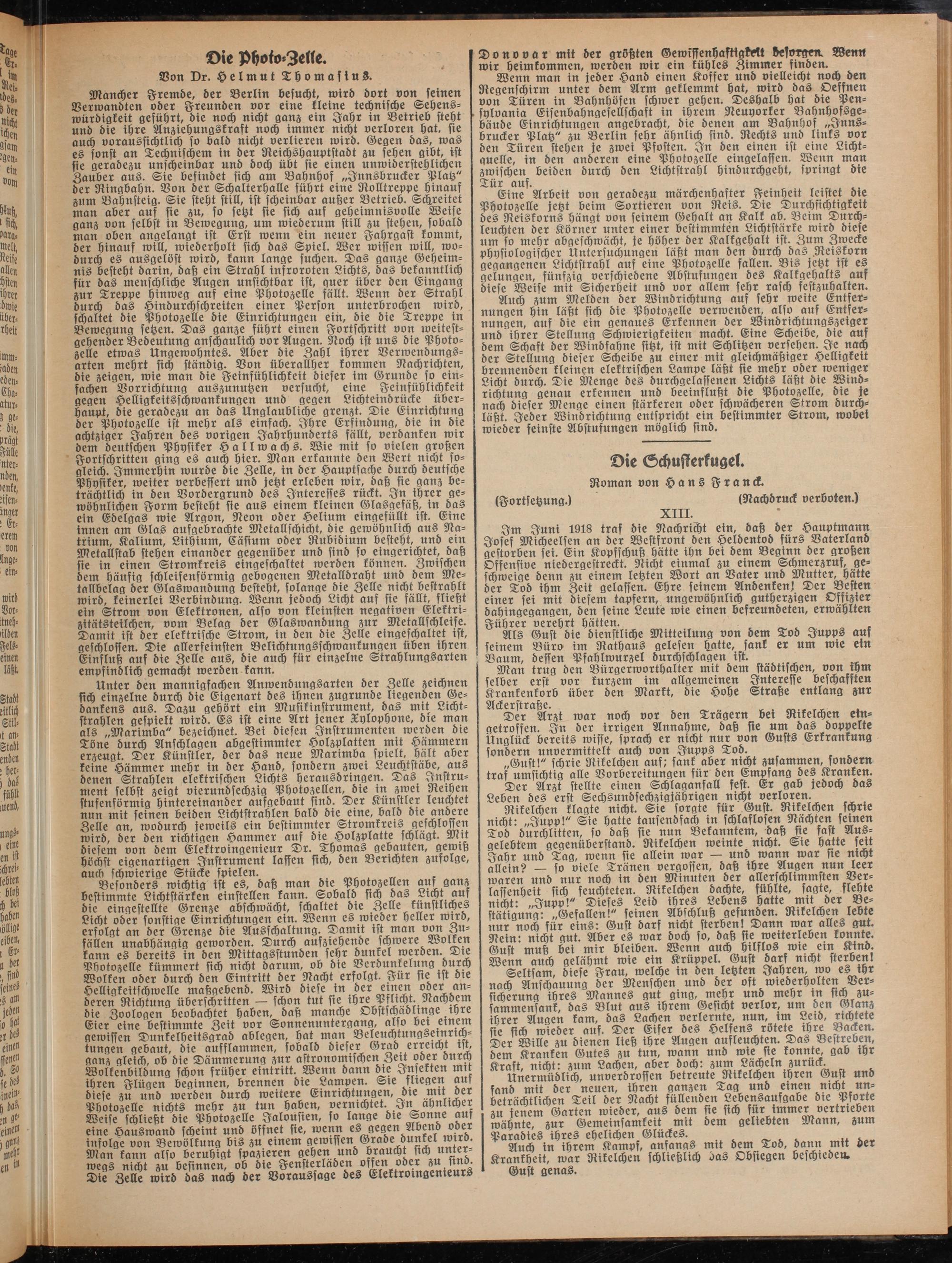 Mancher Fremde, der Berlin besucht, wird dort von seinen Verwandten oder Freunden vor eine kleine technische Sehenswürdigkeit geführt, die noch nicht ganz ein Jahr in Betrieb steht und die ihre Anziehungskraft noch immer nicht verloren hat. sie auch voraussichtlich so bald nicht verlieren wird. Gegen das, was es sonst an Technischem in der Reichshauptstadt zu sehen gibt, ist sie geradezu unscheinbar und doch übt sie einen unwiderstehlichen Zauber aus. Sie befindet sich am Bahnhof „Innsbrucker Platz" der Ringbahn. Von der Schalterhalle führt eine Rolltreppe hinauf zum Bahnsteig. Sie steht still, ist scheinbar außer Betrieb. Schreitet man aber auf sie zu, so setzt sie sich auf geheimnisvolle Weise ganz von selbst in Bewegung, um wiederum still zu stehen, sobald man oben angelangt ist Erst wenn ein neuer Fahrgast kommt, der hinauf will, wiederholt sich das Spiel. Wer wissen will, wodurch es ausgelöst wird, kann lange suchen. Das ganze Geheimnis besteht darin, daß ein Strahl infraroten Lichts, das bekanntlich für das menschliche Augen unsichtbar ist, quer über den Eingang zur Treppe hinweg auf eine Photozelle fällt. Wenn der Strahl durch das Hindurchschreiten einer Person unterbrochen wird, schaltet die Photozelle die Einrichtungen ein, die die Treppe in Bewegung setzen. Das ganze führt einen Fortschritt von weitestgehender Bedeutung anschaulich vor Augen. Noch ist uns die Photozelle etwas Ungewohntes. Aber die Zahl ihrer Verwendungsarten mehrt sich ständig. Von überallher kommen Nachrichten, die zeigen, wie man die Feinfühlichkeit dieser im Grunde so einfachen Vorrichtung auszunutzen versucht, eine Feinfühlichkeit gegen Helligkeitsschwankungen und gegen Lichteindrücke überhaupt, die geradezu an das Unglaubliche grenzt. Die Einrichtung der Photozelle ist mehr als einfach. Ihre Erfindung, die in die achtziger Jahren des vorigen Jahrhunderts fällt, verdanken wir dem deutschen Physiker Hallwachs. Wie mit so vielen großen Fortschritten ging es auch hier. Man erkannte den Wert nicht sogleich. Immerhin wurde die Zelle, in der Hauptsache durch deutsche Physiker, weiter verbessert und jetzt erleben wir, daß sie ganz beträchtlich in den Vordergrund des Interesses rückt. In ihrer gewöhnlichen Form besteht sie aus einem kleinen Glasgefäß, in das ein Edelgas wie Argon, Neon oder Helium eingefüllt ist. Eine innen am Glas aufgebrachte Metallschicht, die gewöhnlich aus Natrium, Kalium, Lithium, Cäsium oder Rubidium besteht, und ein Metallstab stehen einander gegenüber und sind so eingerichtet, daß sie in einen Stromkreis eingeschaltet werden können. Zwischen dem häufig schleifenförmig gebogenen Metalldraht und dem Me- tallbclag der Glaswandung besteht, solange die Zelle nicht bestrahlt wird, keinerlei Verbindung. Wenn jedoch Licht auf sie fällt, fließt ein Strom von Elektronen, also von kleinsten negativen Elektrizitätsteilchen, vom Belag der Glaswandung zur Metallschleife. Damit ist der elektrische Strom, in den die Zelle eingeschaltet ist, geschloffen. Die allerfeinsten Bclichtungsschwankungen üben ihren Einfluß auf die Zelle aus, die auch für einzelne Strahlungsarten empfindlich gemacht werden kann.