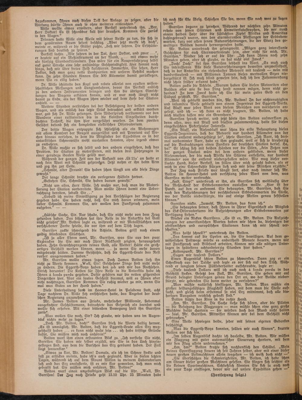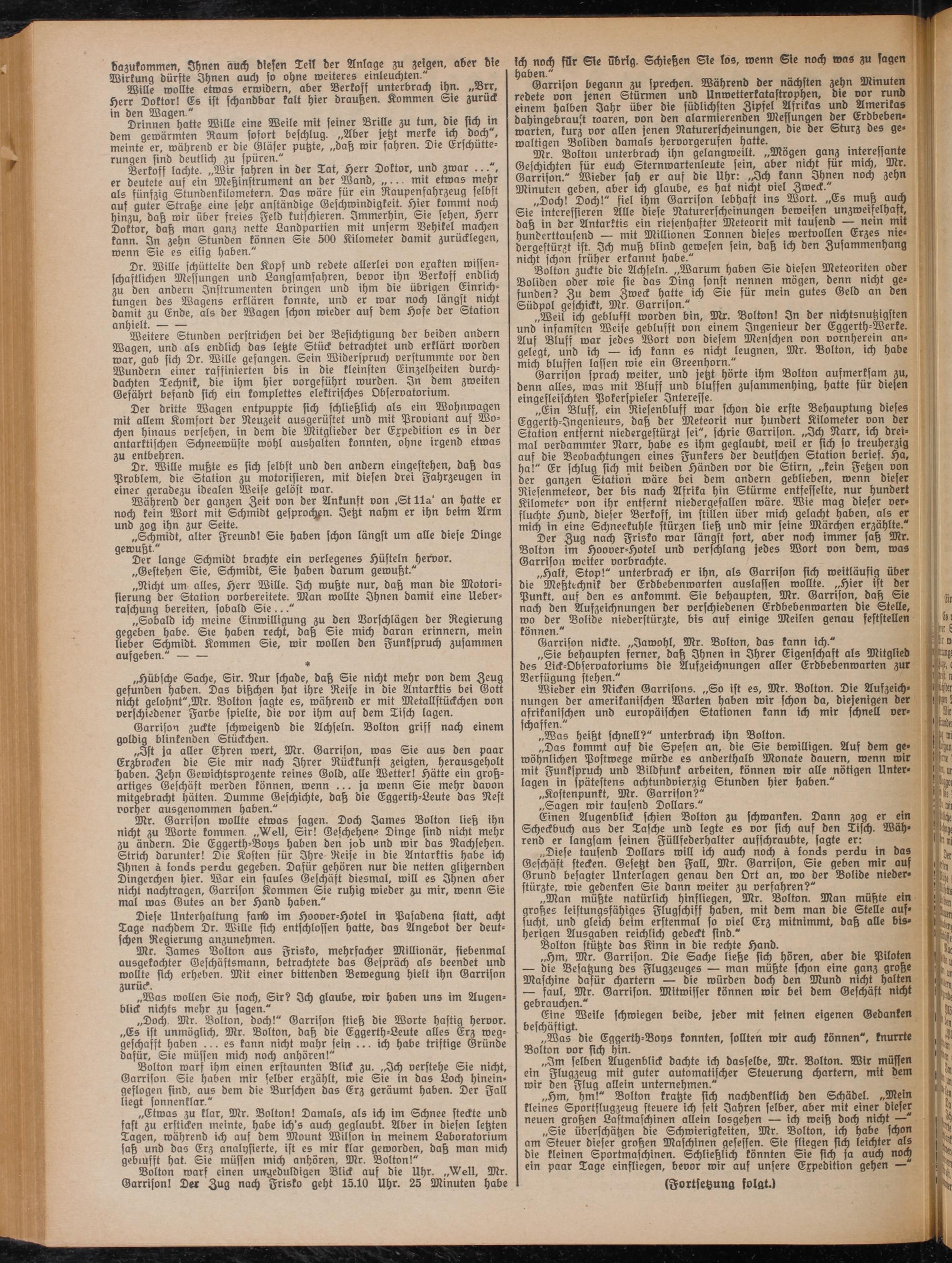 „Man müßte natürlich hinfliegen, Mr. Bolton. Man müßte ein großes leistungsfähiges Flugschiff haben, mit bem man bie Stelle aufsucht, unb gleich beim erstenmal so viel Erz mitnimmt, daß alle bisherigen Ausgaben reichlich gebeckt sinb."