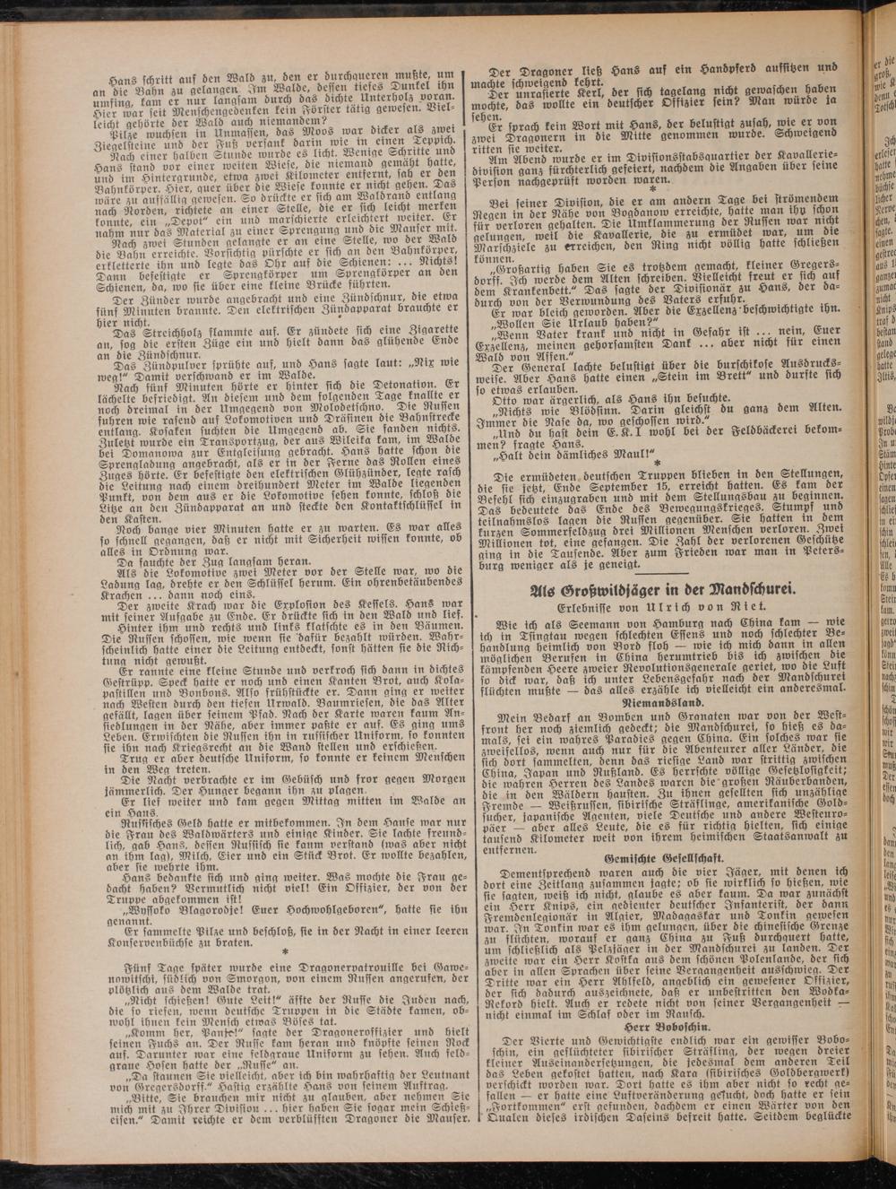 Wie ich als Seemann von Hamburg nach China kam — wie ich in Tsingtau wegen schlechten Essens und noch schlechter Behandlung heimlich von Bord floh — wie ich mich dann in allen möglichen Berufen in China herumtrieb bis ich zwischen die kämpfenden Heere zweier Revolutionsgenerale geriet, wo die Lust so dick war, daß ich unter Lebensgefahr nach der Mandschurei flüchten mutzte — das alles erzähle ich vielleicht ein anderesmal.