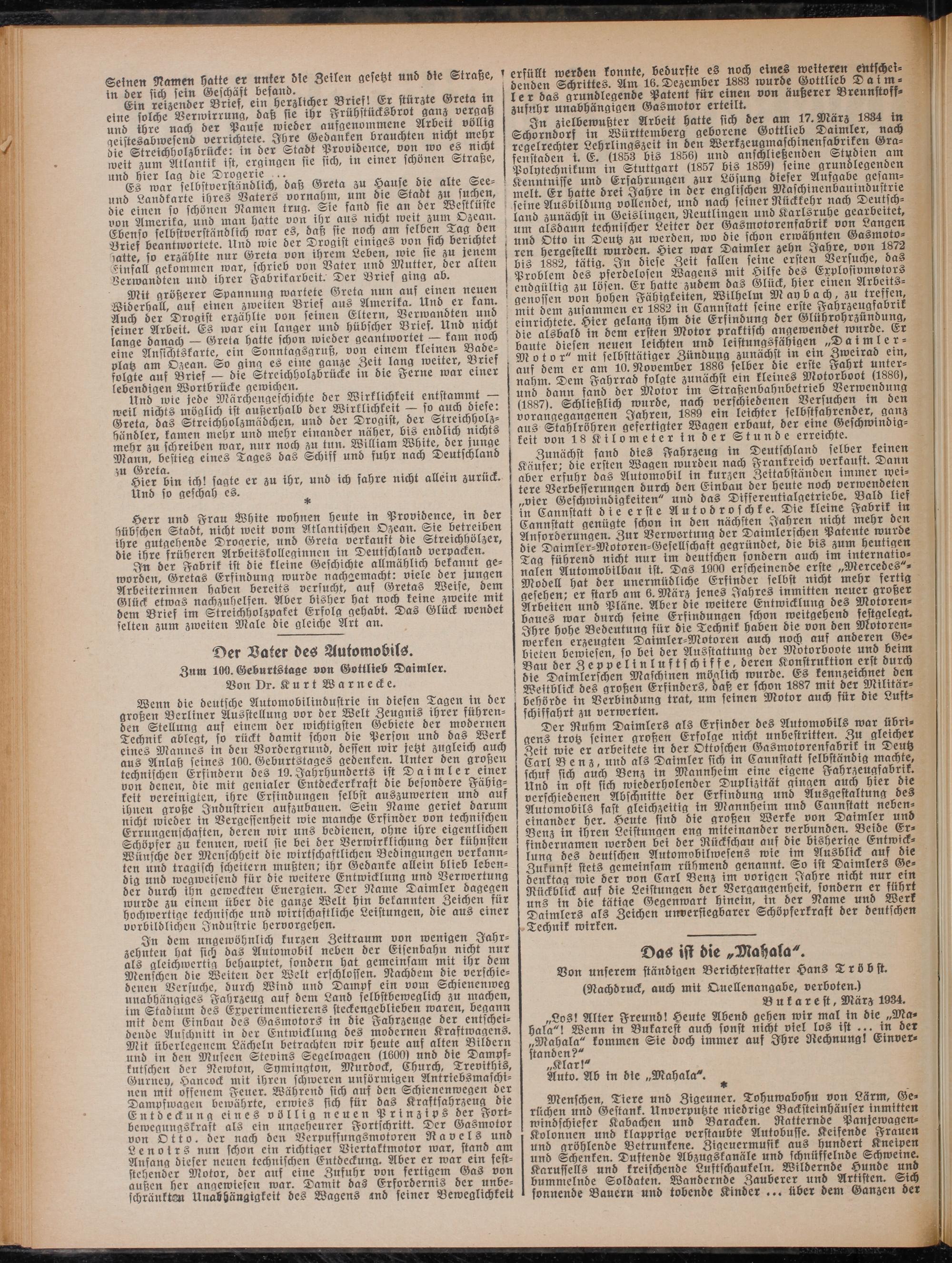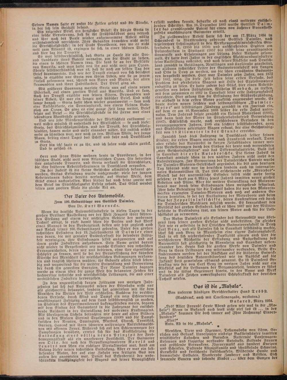 Wenn die deutsche Automobilindustrie in diesen Tagen in der großen Berliner Ausstellung vor der Welt Zeugnis ihrer führenden Stellung auf einem der wichtigsten Gebiete der modernen Technik ablegt, so rückt damit schon die Person und das Werk eines Mannes in den Vordergrund, dessen wir jetzt zugleich auch aus Anlaß seines 100. Geburtstages gedenken. Unter den großen technischen Erfindern des 19.Jahrhunderts ist Daimler einer von denen, die mit genialer Entdeckerkraft die besondere Fähigkeit vereinigten, ihre Erfindungen selbst auszuwerten und aus ihnen große Industrien aufzubauen. Sein Name geriet darum nicht wieder in Vergesfenheit rote manche Erfinder von technischen Errungenschaften, deren roir uns bedienen, ohne ihre eigentlichen Schöpfer zu kennen, roeil sie bei der Verwirklichung der kühnsten Wünsche der Menschheit die wirtschaftlichen Bedingungen verkannten und tragisch scheitern mußten; ihr Gedanke allein blieb lebendig und wegweisend für die weitere Entwicklung und Verwertung der durch ihn geweckten Energien. Der Name Daimler dagegen wurde zu einem über die ganze Welt hin bekannten Zeichen für hochwertige technische und wirtschaftliche Leistungen, die aus einer vorbildlichen Industrie hervorgehen.
