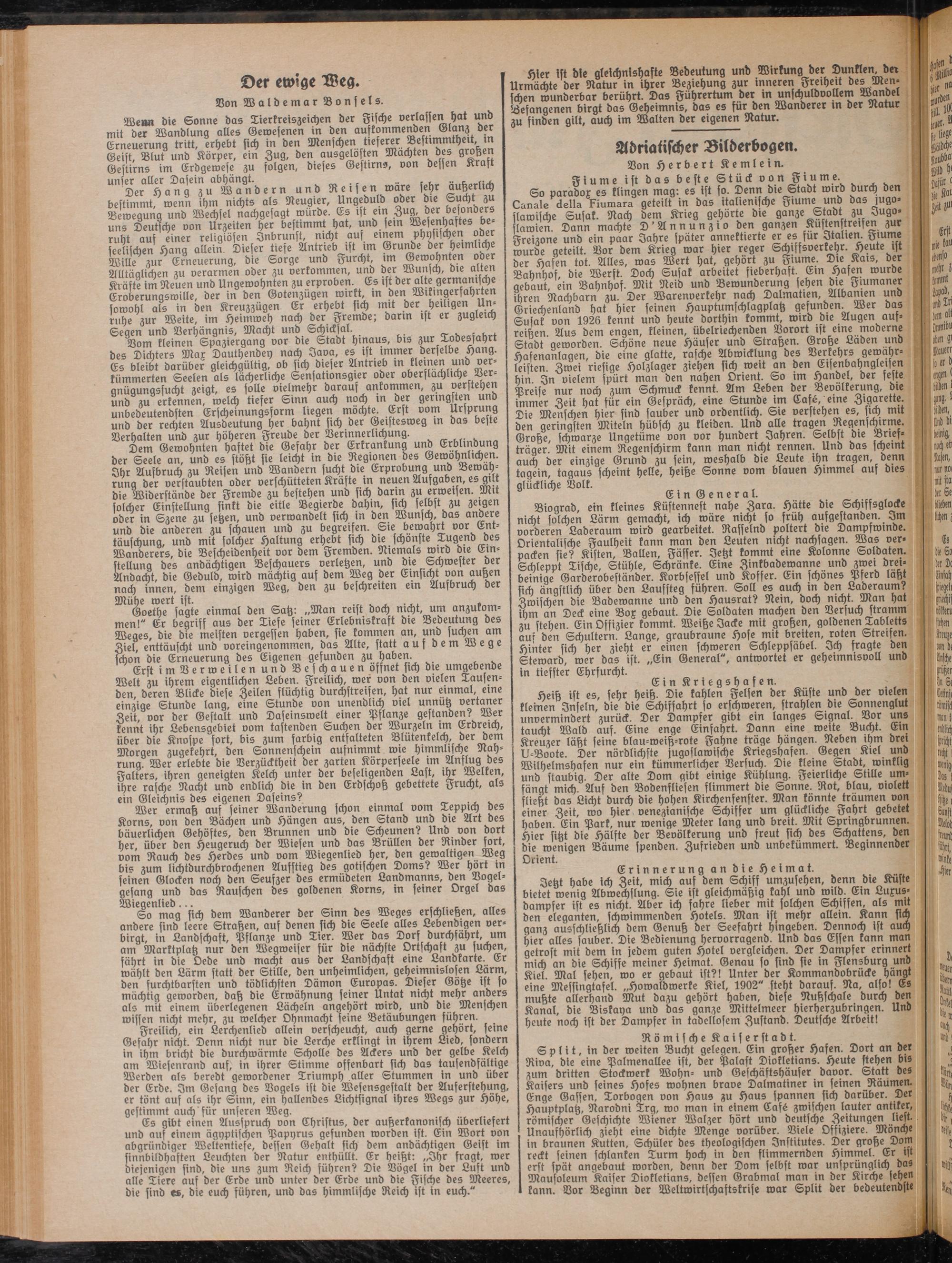 Split, in der weiten Bucht gelegen. Ein großer Hafen. Dort an der Riva, die eine Palmenallee ist, der Palast Diokletians. Heute stehen bis zum dritten Stockwerk Wohn- und Geschäftshäuser davor. Statt des Kaisers und seines Hofes wohnen brave Dalmatiner in feinen Räumen. Enge Gaffen, Torbogen von Haus zu Haus spannen sich darüber. Der Haüptplatz, Narodni Trg, wo man in einem Cafe zwischen lauter antiker, römischer Geschichte Wiener Walzer hört und deutsche Zeitungen liest. Unaufhörlich zieht eine dichte Menge vorüber. Viele Offiziere. Mönche in braunen Kutten, Schüler des theologischen Institutes. Der große Dom reckt seinen schlanken Turm hoch in den flimmernden Himmel. Er ist erst spät angebaut worden, denn der Dom selbst war unsprünglich das Mausoleum Kaiser Diokletians, dessen Grabmal man in der Kirche sehen kann. Vor Beginn der Weltwirtschaftskrise war Split der bedeutendste