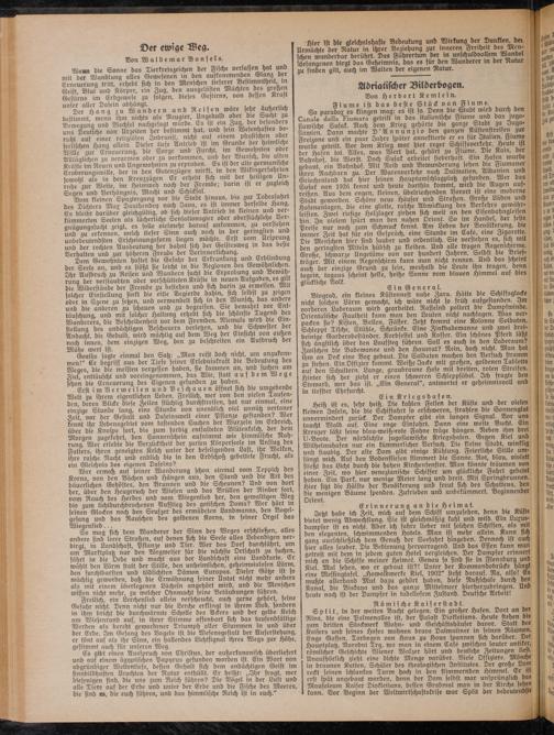 So paradox es klingen mag: es ist fo. Denn die Stadt wird durch den Canale della Fiumara geteilt in das italienische Fiume und das ,ugo- slawische Susak. Nach dem Krieg gehörte die ganze Stadt zu Jugoslawien. Dann machte D'Annunzio den ganzen Kustenstreifen zur Freizone und ein paar Jahre später annektierte er es für Italien. Fiume wurde geteilt. Vor dem Krieg war hier reger Schlsssverkehr. Heute ist der Hafen tot. Alles, was Wert hat, gehört zu Fiume. Die Kais, der Bahnhof die Werft. Doch Susak arbeitet fieberhaft. Em Hafen wurde gebaut, ein Bahnhof. Mit Neid und Bewunderung sehen die Fmmaner ihren Nachbarn zu. Der Warenverkehr nach Dalmatien, Albanien und Griechenland hat hier seinen Hauptumschlagplatz gefunden Wer das Susak von 1926 kennt und heute dorthin kommt, wird die Augen auf- reitzen. Aus dem engen, kleinen, übelriechenden Vorort ist eme moderne Stadt geworden. Schöne neue Häuser und Straßen. Große Läden und Hasenanlagen, die eine glatte, rasche Abwicklung des Verkehrs gewährleisten. Zwei riesige Holzlager ziehen sich weit an den Eisenbahngleisen bin In vielem spürt man den nahen Orient. So im Handel, der feste Preise nur noch zum Schmuck kennt. Am Leben der Bevölkerung, die immer Zeit hat für ein Gespräch, eine Stunde im Cafe, eine Zigarette. Die Menschen hier sind sauber und ordentlich. Sie verstehen es, sich nut den geringsten Miteln hübsch zu kleiden. Und alle tragen Regenschirme. Große, schwarze Ungetüme von vor hundert Jahren. Selbst Die Brief- träger. Mit einem Regenschirm kann man nicht rennen. Und das scheint auch der einzige Grund zu sein, weshalb die Leute ihn tragen, denn tagein, tagaus scheint helle, heiße Sonne vom blauen Himmel auf dies glückliche Volk.