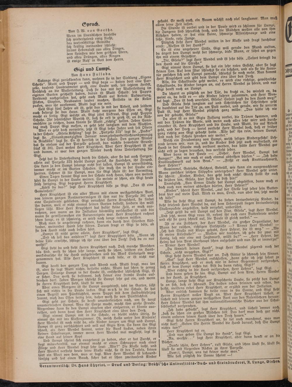 Und dann gchen sie los. Gigi, Lumpi auf dem Arm, Herrn Wendel 011 Lang^°"ange" sieh^Gigi vor Krupschert? Laube, sie preßt den Lumpi so an sich, daß er schnauft. Die beiden reden drinnen und reden, das heißt, meistens redet Herr Krupschert, er erzählt von der ^nft^ion 9 Aber endlich kommen sie beide raus m die Sonne und fierrn Krupschert voller Angst an. Aber Herr Krupschert lächelt, er lächelt mit seinem ganzen weihgelben Bart aus den Nasenlöchern herau . Herr Lehrer Wendel hat ihm nationalökonomische Bucher aus der Schul bcklwchek veisproch^en.", ^err Krupschert, und lächelt immer noch, „daß du schon ein großes Mädchen bist Das darf, man doch gar mcht, einem anderen seinen fiunb über den D^eh hauen. n