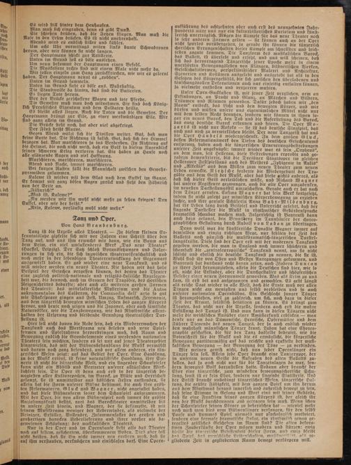 Hier soll nicht davon die Rede sein, daß ein Wiedererwachen der Tanzkunst auch das Wortörama neu beleben und neue Spielformen und Spielrahmen hervorbringen muß, daß Raum und Bewegung endlich die Grundelemente eines werdenden nationalen Theaters sein möchten, sondern es sei nur auf jenes Theatergebiet hingcwiesen, das mit der Bühnenbehandlung die Musik vermählt und darum noch ganz besonders, und vor allem anderen, ein tänzerisches Wesen zeigt: auf das Gebiet der Oper. Eine Handlung, zu der Musik ertönt, ist keine naturalistische Handlung, ihre Szenerie ist nicht die bürgerliche Welt, und ein singender Schauspieler kann nicht ein Abbild und Vertreter unserer alltäglichen Wirklichkeit fein. Die Oper ist denn auch erst in der tänzerisch bewegtesten aller Kulturepochen, im Barock, zu Blüte und Herrschaft gelangt, sie ist unmittelbar aus höfischen Festen entstanden, sie allein hat die Form unserer Bühne bestimmt, die auch ihre größten Reformatoren. Gluck und Wagner, nicht angetastet haben, und hat diese Vühnenform soaar dem Schauspiel aufgezwungen. Mit der Oper, die von allem Bühnenspiel noch immer die größte Anziehungskraft besitzt, ragt das Barocktheater unmittelbar bis in unsere Zeit hinein, und Wagner, der sie bekämpfte, ist mit seinem Musikörama weniger der Ueberwinder, als vielmehr der Reiniger, Erfüller, Vollender, Zusammenfaffer der großen und großartigen barocken Ueberlieferung und ihrer vorher nie dagewesenen Schöpfung: des musikalischen Tbeaters.