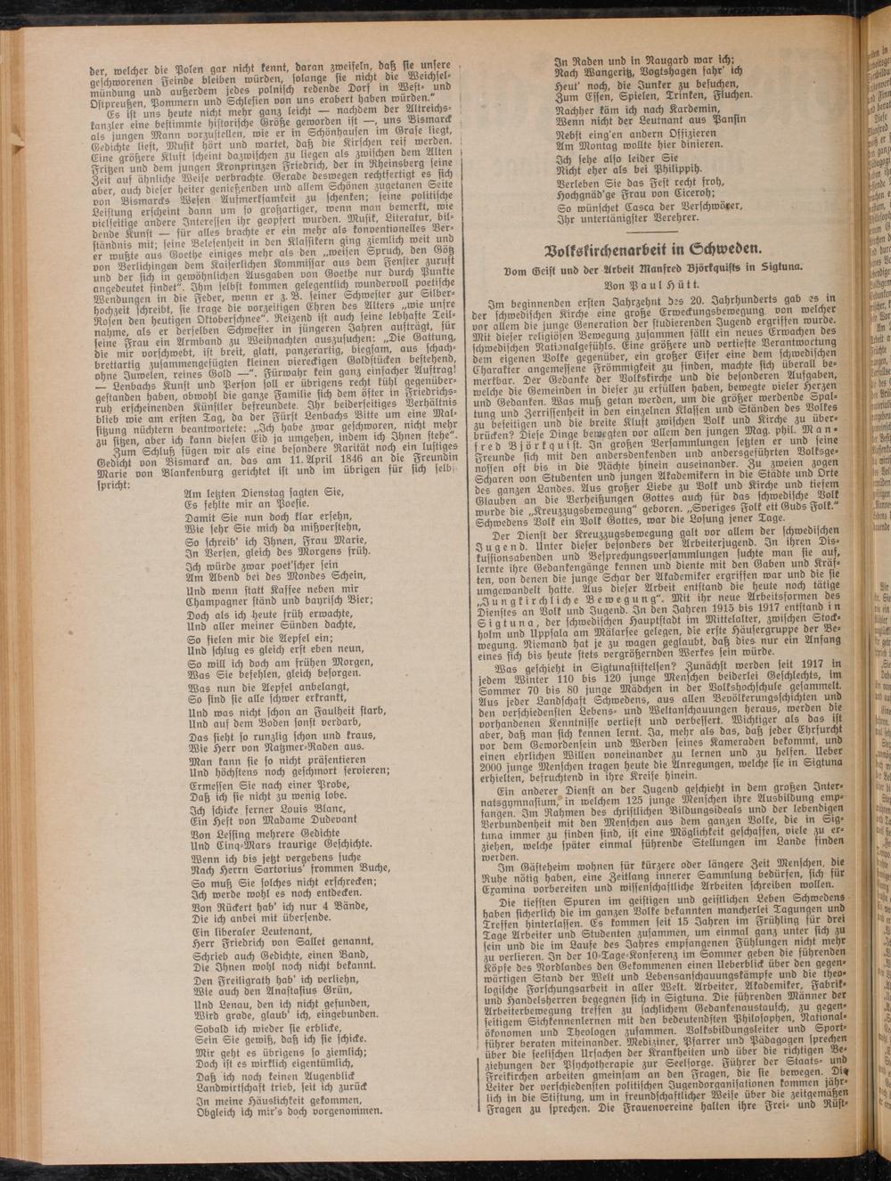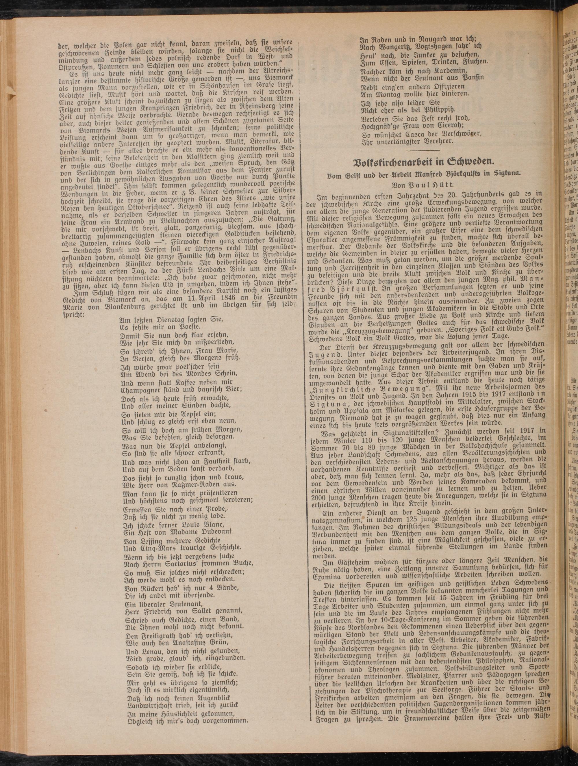 Im beginnenden ersten Jahrzehnt des 20. Jahrhunderts gab « in ber chwedischen Kirche eine große Erweckungsberoegung von welcher vor allem bie junge Generation ber ftubierenben Jugend ergriffen würbe Mit biefer religiösen Bewegung zusammen fallt ein Erwachen des schroebischen Nationalgefühls. Eine größere unb vertiefte Derantwo ung bem eigenen Volke gegenüber, ein großer Elfer eine dem schwedischen Charakter angemessene Frömmigkeit zu fmben, wachte sich überall bemerkbar. Der Gebanke ber Volkskirche unb die besonderen Aufgaben welche bie Gemeinben in biefer zu erfüllen Haden, bewegte vieler Herzen unb Gebauten. Was muß getan werben, um bie großer werbende Spaltung unb Zerrissenheit in ben einzelnen Klassen unb Stauben bes Volkes zu beseitigen unb bie breite Kluft zwischen Volk unb Kirche zu überbrücken^ Diese Dinge bewegten vor allem den jungen Mag. phu. M a n - sreb Björkguist. In großen Versammlungen setzten er unb feine ftreunbe sich mit ben anbersbentenben unb anbersgesuhrten Volksgenossen oft bis in bie Nächte hinein auseinander. Zu zweien zogen Scharen von Studenten unb jungen Akademikern m bie Stabte unb Orte des ganzen Laubes. Aus großer Liebe zu Volk unb Kirche unb tiefem Glauben an bie Verheißungen Gottes auch für das schweb» che Volk würbe bie „Kreuzzugsbeweguug" geboren. „Sveriges Folk ett Gubs Folk. Schwebens Volk ein Volk Gottes, war bie ßofung jener Tage.