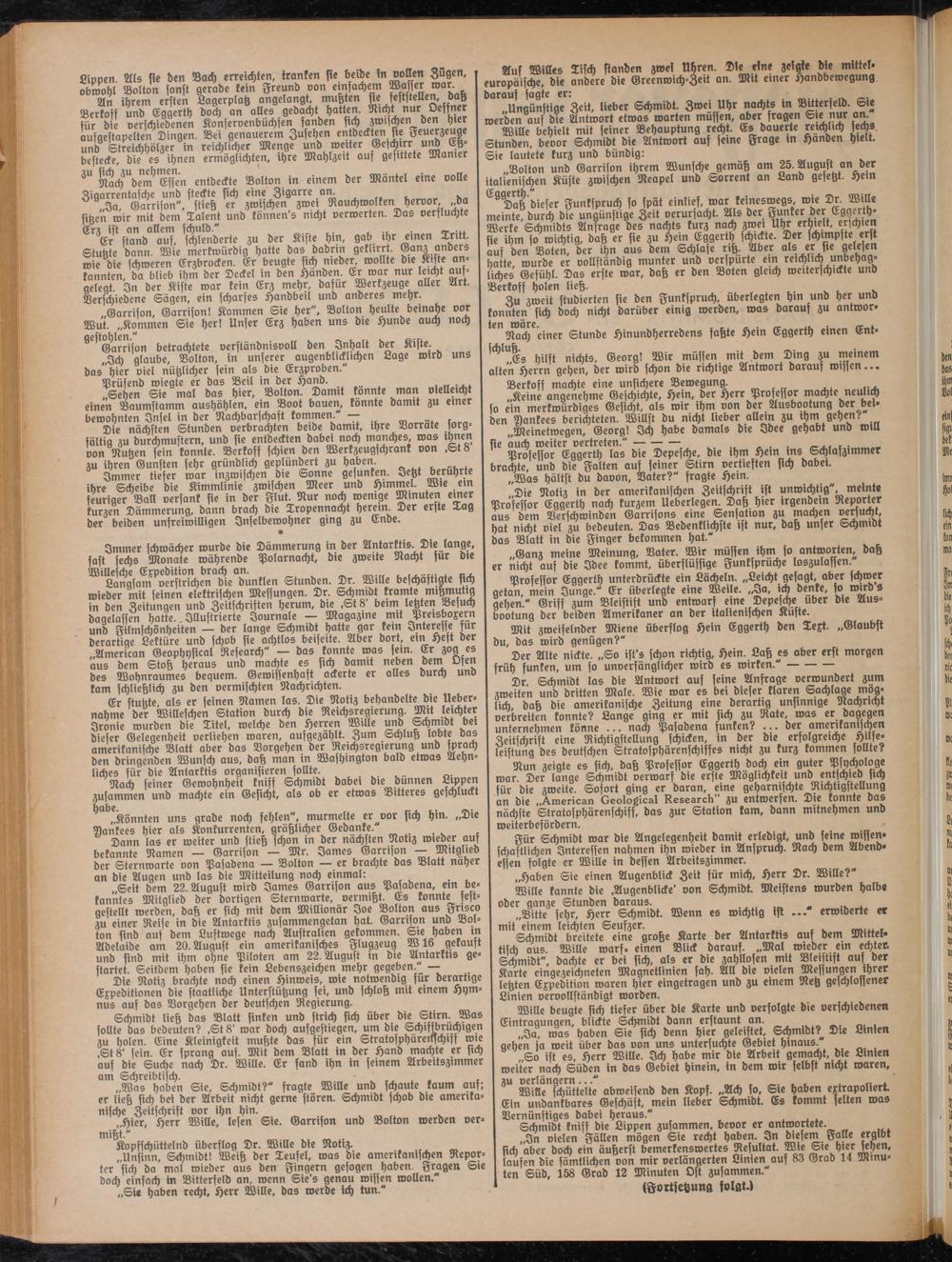 „Seit bem 22. August wirb James Garrison aus Pasadena, em bekanntes Mitglied der dortigen Sternwarte, vermißt. Es konnte fest- gestellt werden, daß er sich mit bem Millionär Joe Bolton aus Frisco zu einer Reife in bie Antarktis zusammengetan hat. Garrifon unb Bolton sind auf bem Luftwege nach Australien gekommen. Sie haben tn Abelaibe am 20. August ein amerikanisches Flugzeug W16 gekauft unb sind mit ihm ohne Piloten am 22. August in bie Antarktis gestartet. Seitbem haben sie kein Lebenszeichen mehr gegeben." —