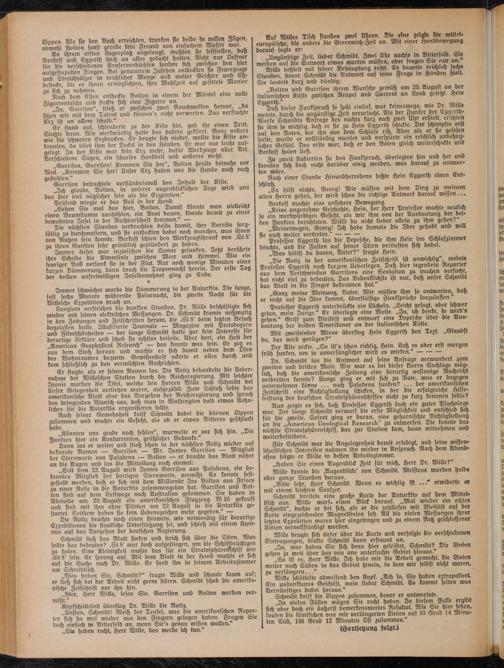 Er stutzte, als er feinen Namen las. Die Notiz behandelte die Ueber- nahme der Willeschen Station durch die Reichsregierung. Mit leichter Ironie wurden die Titel, welche den Herren Wille und Schmidt bei dieser Gelegenheit verliehen waren, aufgezählt. Zum Schluß lobte das amerikanische Blatt aber das Vorgehen der Reichsregierung und sprach den dringenden Wunsch aus, daß man in Washington bald etwas Aehn- liches für die Antarktis organisieren sollte.