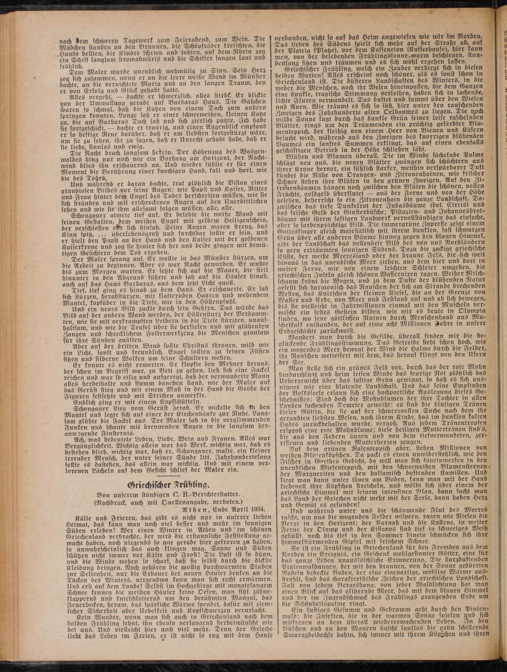 Griechischer Frühling, welch ein Zauber verbirgt sich in diesen beiden Worten! Alles erscheint noch schöner, als es sonst schon tn Griechenland ist. Die düsteren Landschaften des Winters, in die weder die Menschen, noch ihr Wesen hincinpassen, die dem Ganzen eine dunkle, tragische Stimmung verleihen, haben sich in lachende, lichte Fluren verwandelt. Das duftet und summt über den Wiesen und Auen. Wie träumt es sich so süß, hier unter den rauschenden Zweigen des Jahrhunderte alten Oelbaumes zu liegen. Dte npaj wilde Sonne lugt durch das dunkle Grün seiner leise raschelnden Blätter, rings um den Träumenden ein prächtig gefärbter Blumenteppich, der fleißig von einem Heer von Bienen und Käfern besucht wird, während aus den Zweigen des knorrigen blühenden Baumes ein sanftes Summen erklingt, das auf einen ebenfalls geschäftigen Betrieb in der Höhe schließen läßt.