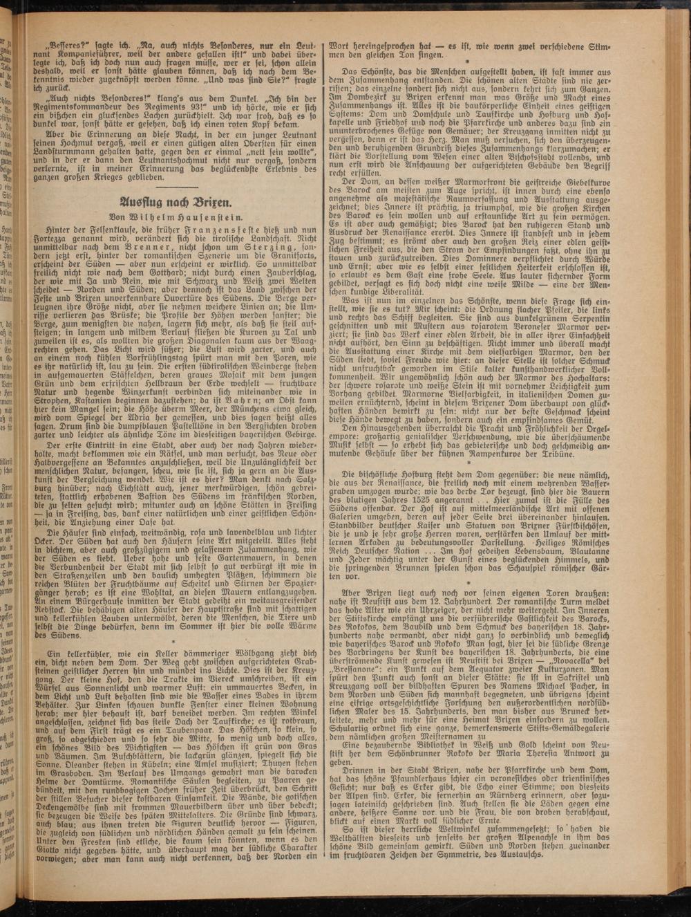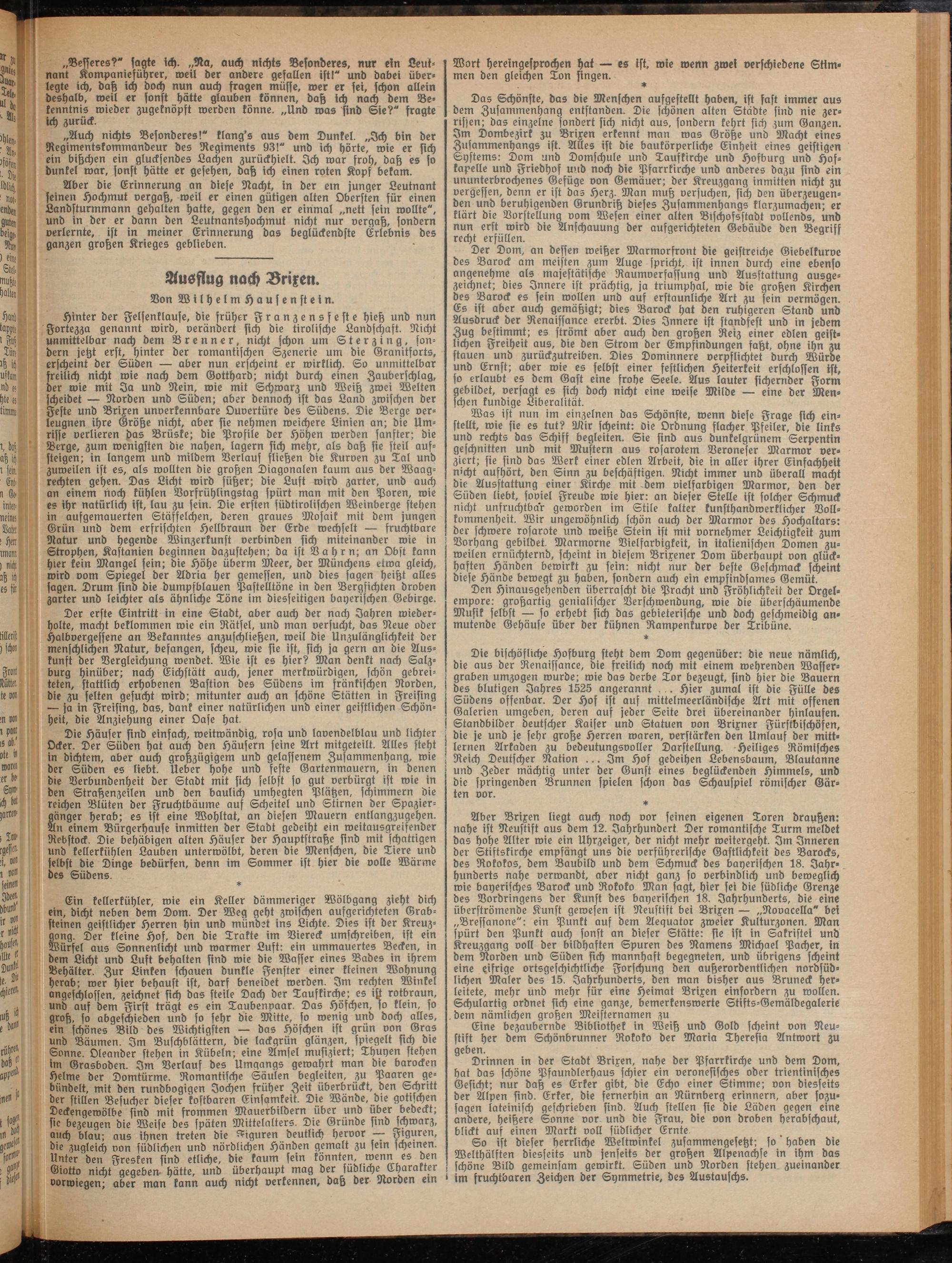 Drinnen in ber Stabt Brixen, nahe ber Pfarrkirche unb bem Dom, hat das schöne Pfaundlerhaus schier ein veronesisches ober trientinisches Gesicht; nur baß es Erker gibt, bie Echo einer Stimme; von biesseits ber Alpen finb. Erker, bie fernerhin an Nürnberg erinnern, aber sozusagen lateinisch geschrieben finb. Auch stellen sie bie Säben gegen eine anbere, heißere Sonne vor unb bie Frau, bie von droben herabschaut, blickt aus einen Markt voll südlicher Ernte
