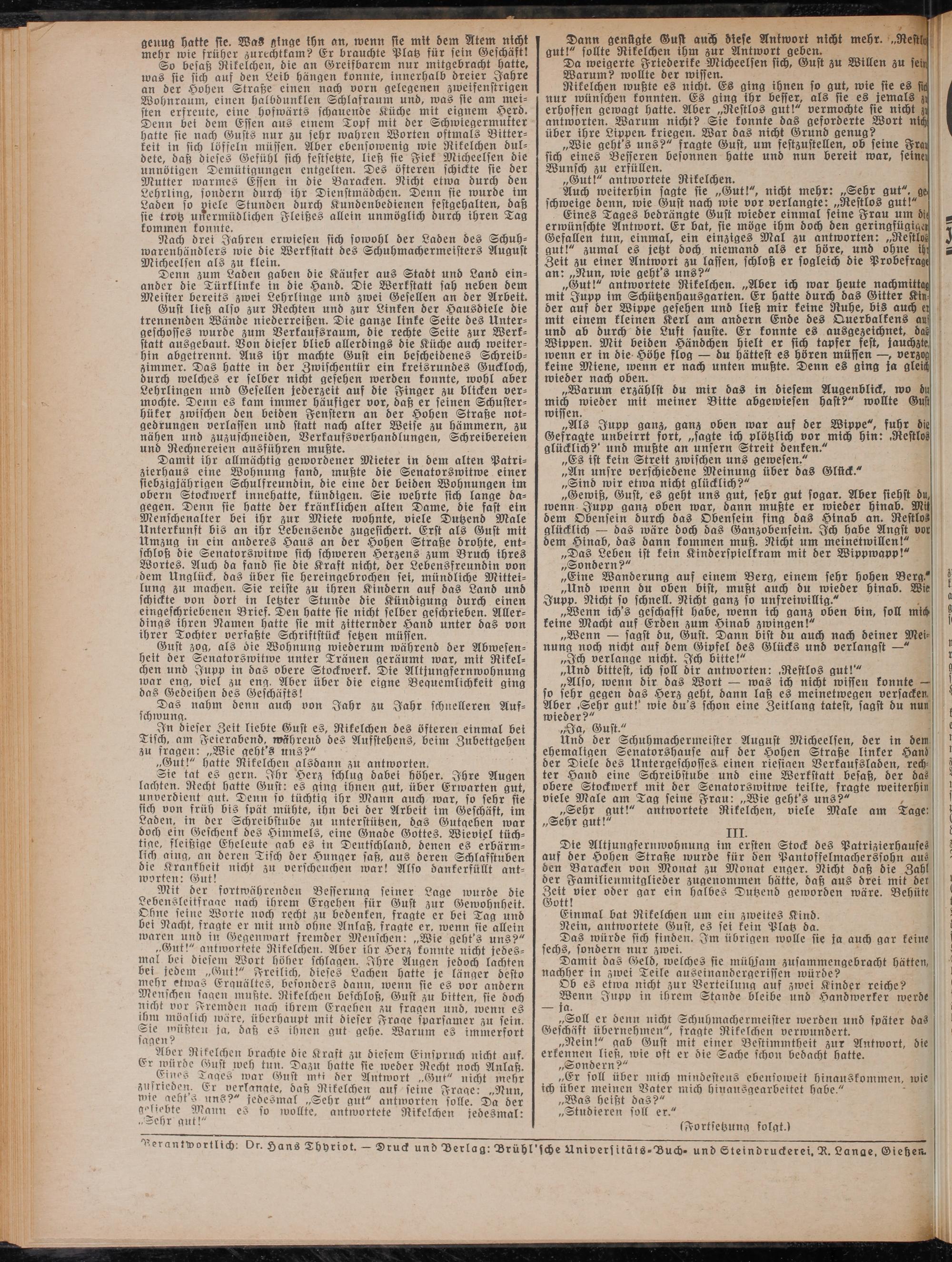 Gust zog, als die Wohnung wiederum während der Abwesenheit der Senatorswitwe unter Tränen geräumt war, mit Rikelchen und Jupp in das obere Stockwerk. Die Altjungfernwohnung war eng, viel zu eng. Aber über die eigne Bequemlichkeit ging das Gedeihen des Geschäfts!