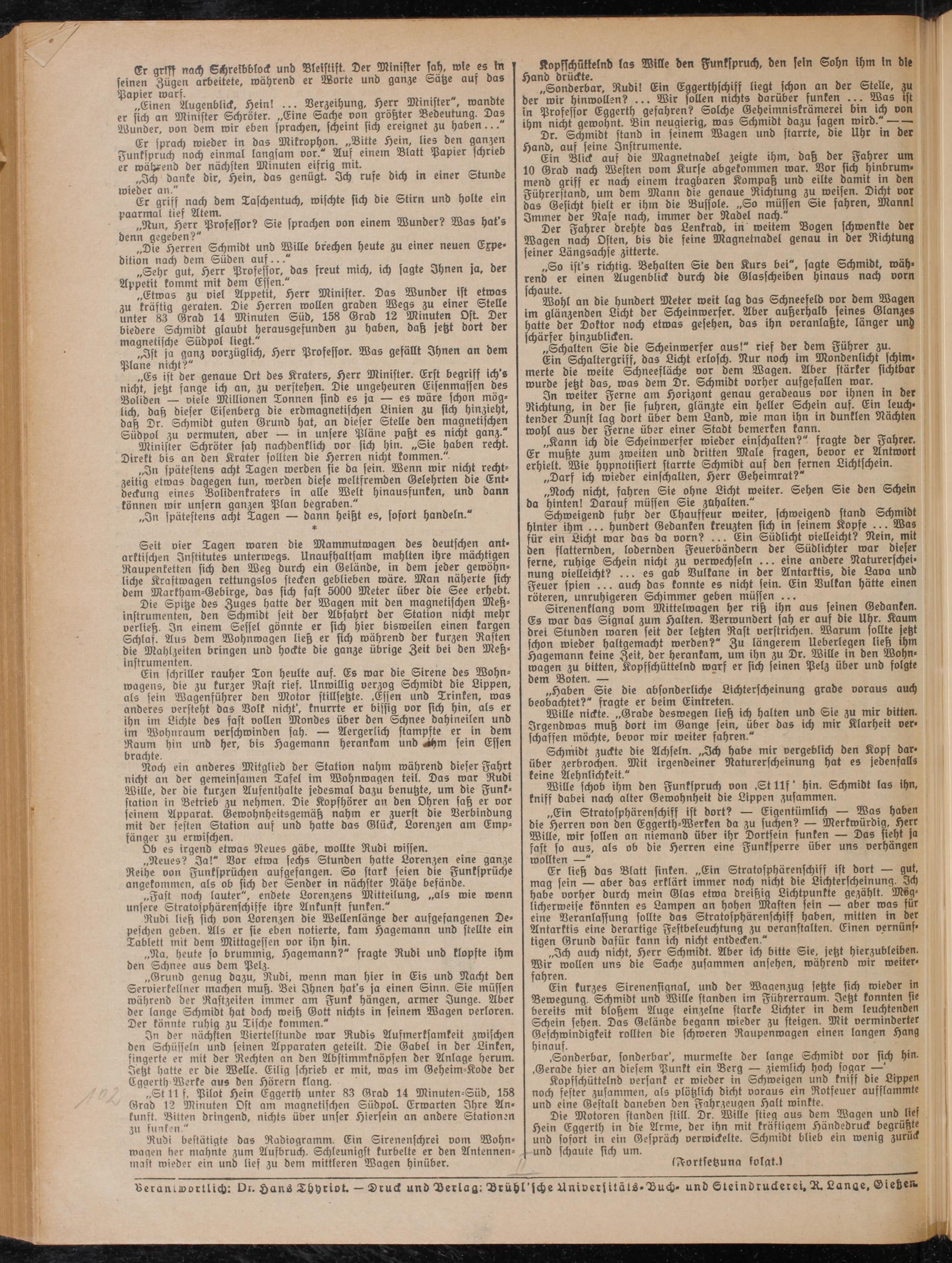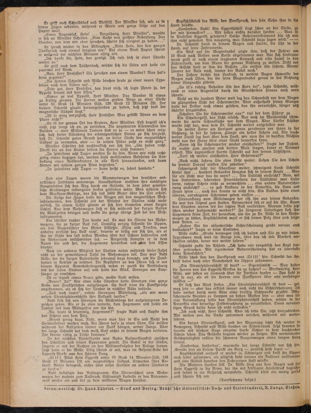 Schweigend fuhr der Chauffeur weiter, schweigend stand Schmidt hinter ihm ... hundert Gedanken kreuzten sich in seinem Kopse ... Was für ein Licht war das da vorn? ... Ein Südlicht vielleicht? Nein, mit den flatternden, lodernden Feuerbändern der Südlichter war dieser ferne, ruhige Schein nicht zu verwechseln ... eine andere Naturerscheinung vielleicht? ... es gab Vulkane in der Antarktis, die Lava und Feuer spien ... auch das konnte es nicht fein. Ein Vulkan hätte einen röteren, unruhigeren Schimmer geben müssen ...