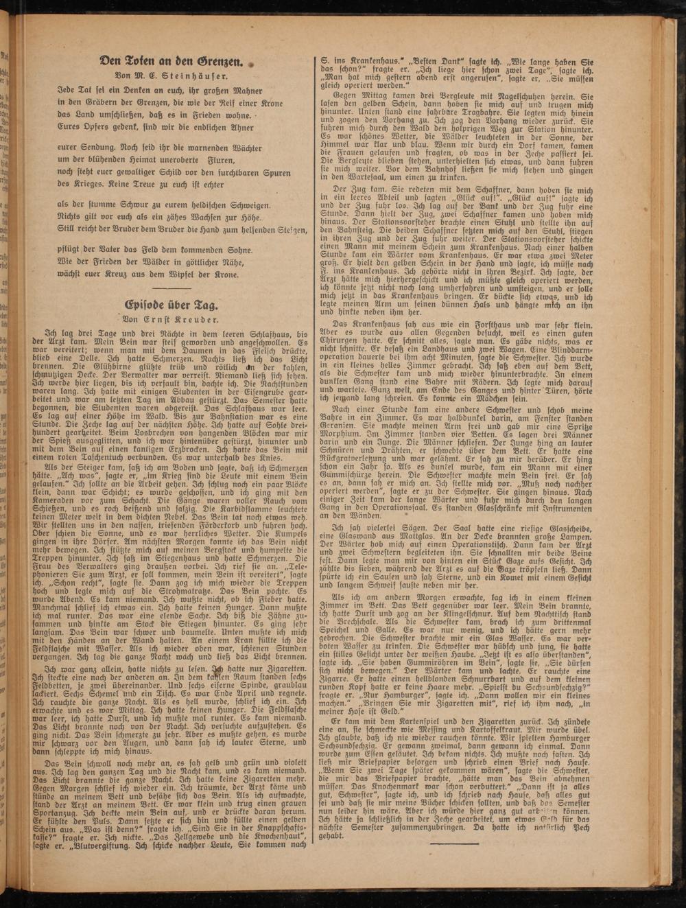 eurer Sendung. Noch seid ihr die warnenden Wächter um der blühenden Heimat uneroberte Fluren, noch steht euer gewaltiger Schild vor den furchtbaren Spuren des Krieges. Keine Treue zu euch ist echter
