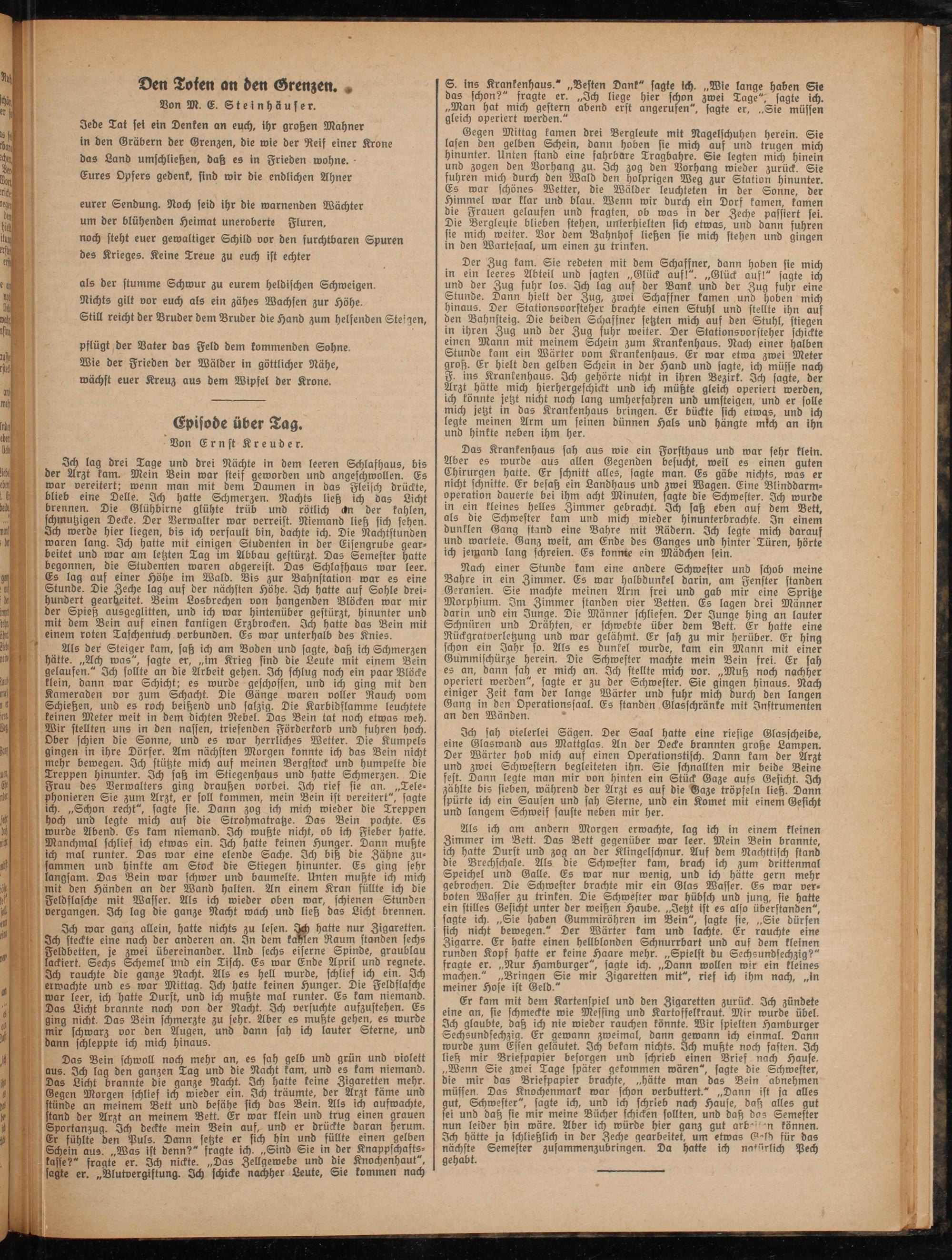 Jede Tat sei ein Denken an euch, ihr großen Mahner in den Gräbern der Grenzen, die wie der Reif einer Krone das Land umschließen, daß es in Frieden wohne. • Eures Opfers gedenk, find wir die endlichen Ahner