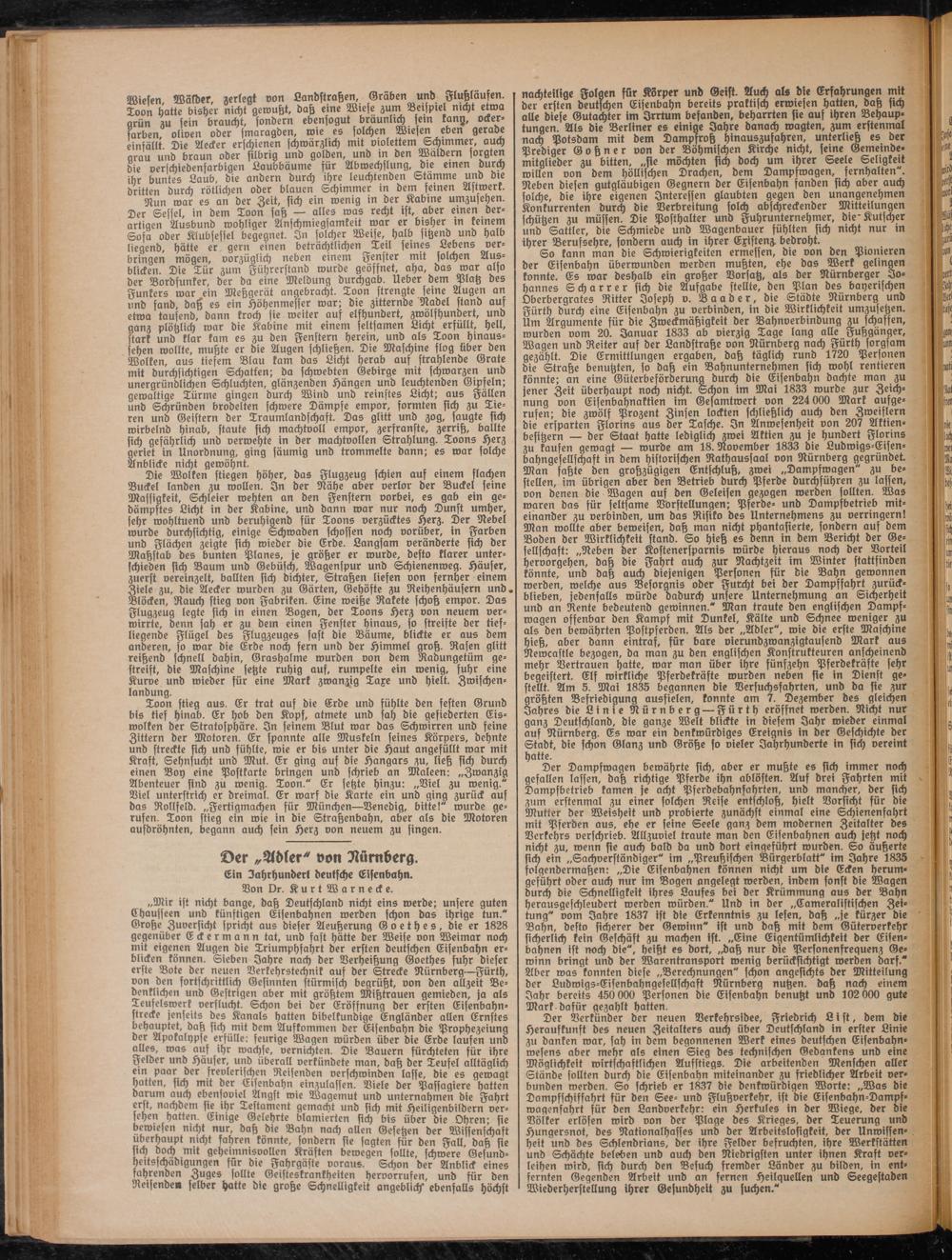 So kann man die Schwierigkeiten ermessen, die von ben Pionieren ber Eisenbahn überrounben werben muhten, ehe bas Werk gelingen konnte. Es war beshalb ein großer Vorsatz, als ber Nürnberger Johannes Scharrer sich bie Aufgabe stellte, den Plan des bayerischen Oberbergrates Ritter Joseph v. Baader, die Städte Nürnberg unb Fürth durch eine Eisenbahn zu verbinden, in die Wirklichkeit umzusetzen. Um Argumente für die Zweckmäßigkeit ber Bahnverbinbung zu schassen, würben vom 20. Januar 1833 ab vierzig Tage lang alle Fußgänger, Wagen unb Reiter auf ber Landstraße von Nürnberg nach Fürth sorgsam gezählt. Die Ermittlungen ergaben, daß täglich rund 1720 Personen die Straße benutzten, so daß ein Bahnunternehmen sich wohl rentieren könnte; an eine Güterbeförderung durch bie Eisenbahn buchte man zu jener Zeit überhaupt noch nicht. Schon im Mai 1833 würbe zur Zeichnung von Eisenbahnaktien im Gesamtwert von 224 000 Mark aufgerufen; bie zwölf Prozent Zinsen lockten schließlich auch ben Zweiflern bie ersparten Florins aus ber Tasche. In Anwesenheit von 207 Aktienbesitzern — der Staat hatte lediglich zwei Aktien zu je hundert Florins zu kaufen gewagt — wurde am 18. November 1833 bie Ludwigs-Eisen- bahngefellschaft in bem historischen Rathaussaal von Nürnberg gegrünbet Man faßte ben großzügigen Entschluß, zwei „Dampfwagen" zu bestellen, im übrigen aber ben Betrieb durch Pferde durchführen zu lassen, von denen bie Wagen auf ben Gekeifen gezogen werben sollten. Was waren bas für feltfame Vorstellungen; Pferbe- unb Dampfbetrieb mit- einanber zu verbinben, um bas Risiko bes Unternehmens zu verringern! Man wollte aber beweisen, baß man nicht phantasierte, fonbern auf bem Boben ber Wirklichkeit ftanb. So hieß es beim in bem Bericht ber Gesellschaft: „Neben ber Kostenersparnis würde hieraus noch ber Vorteil hervorgehen, baß bie Fahrt auch zur Nachtzeit im Winter ftattfinben könnte, unb baß auch biejenigen Personen für bie Bahn gewonnen werben, welche aus Besorgnis oder Furcht bei ber Dampffahrt zurückblieben, jebenfalls würde dadurch unsere Unternehmung an Sicherheit unb an Rente bebeutenb gewinnen." Man traute ben englischen Dampfwagen offenbar ben Kampf mit Dunkel, Kälte und Schnee weniger zu als den bewährten Postpferben. Ms ber „Adler", wie bie erste Maschine hieß, aber bann eintraf, für bare vierunbzwanzigtausenb Mark aus Newcastle bezogen, ba man zu ben englischen Konstrukteuren anscheinenb mehr Vertrauen hatte, war man über ihre fünfzehn Pferbekräfte fehr begeistert. Elf wirkliche Pferbekräfte würben neben sie in Dienst gestellt. Am 5. Mai 1835 begannen bie Versuchsfahrten, unb ba sie zur größten Befriebigung ausfielen, konnte am 7. Dezember bes gleichen Jahres bie Linie Nürnberg — Fürth eröffnet werben. Nicht nur ganz Deutfchlanb, bie ganze Welt blickte in biefem Jahr roieber einmal auf Nürnberg. Es war ein benfroürbiges Ereignis in ber Geschichte ber Stabt, bie schon Glanz unb Größe so vieler Jahrhunderte in sich vereint hatte.