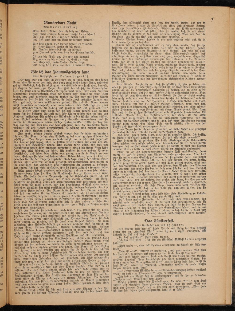 Nun wohl, mitten darein geschah etwas, das sie hätte aufmuntern können. Ihr Mann bekam eine Anstellung bei einer großen Eisenwerksgesellschaft. Das Gehalt war vielleicht nicht um so sehr viel höher als bas, bas er jetzt bezog, aber sie sollten freie Station auf einer ber Besitzungen der Gesellschaft haben. Alle waren barin einig, baß bies ihre Zukunftsaussichten ganz erheblich verbesserte, einzig die junge Frau selbst fuhr fort, alles schwarz zu sehen. Sie mußten in eine andere Provinz übersiedeln, und schon dies allein war genug, um sie in Angst zu versetzen. Solange sie hier auf heimatlichem Boden lebten, hatte sie doch ein gewisses Gefühl der Sicherheit gehabt. Noch dazu muhte der Mann feinen Posten sofort antreten, er war genötigt, vorauszufahren, und muhte es ihr überlasten, bas Einpacken und Fortschicken der Sachen zu besorgen. Sie konnte sich gar nicht vorstellen, wie sie bamit zustanbe kommen sollte.