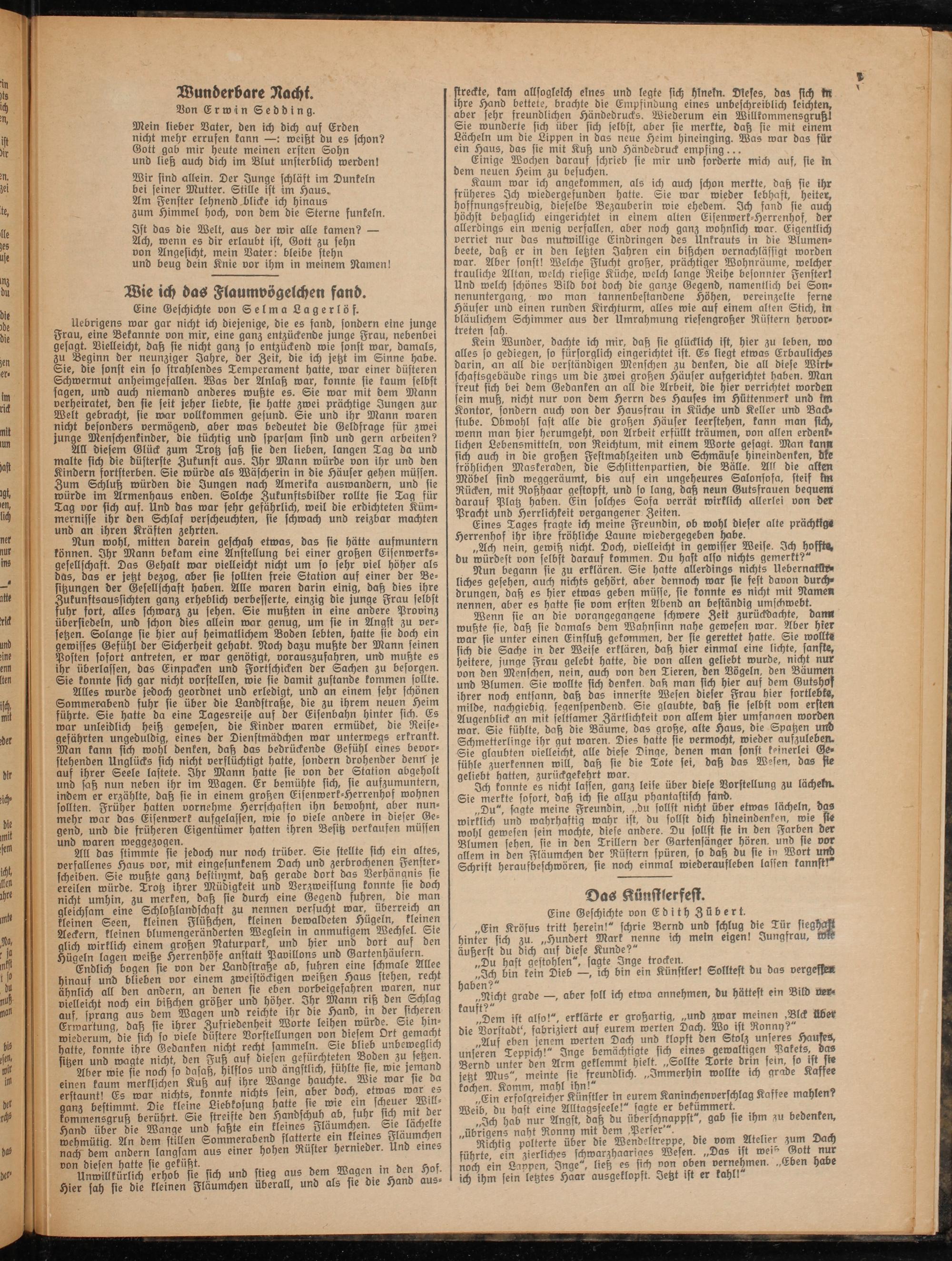 Uebrigens war gar nicht ich biejenige, bie es fanb, fonbern eine junge Frau, eine Bekannte von mir, eine ganz entzückende junge Frau, nebenbei gesagt. Vielleicht, baß sie nicht ganz so entzückenb wie sonst war, damals, zu Beginn der neunziger Jahre, der Zeit, die ich jetzt im Sinne habe. Sie, die sonst ein so strahlendes Temperament hatte, war einer düsteren Schwermut anheimgefallen. Was der Anlaß war, konnte sie kaum selbst sagen, und auch niemand anderes wußte es. Sie war mit dem Mann verheiratet, den sie seit jeher liebte, sie hatte zwei prächtige Jungen zur Welt gebracht, sie war vollkommen gesund. Sie und ihr Mann waren nicht besonders vermögend, aber was bedeutet die Geldfrage für zwei junge Menschenkinder, die tüchtig und sparsam sind und gern arbeiten?