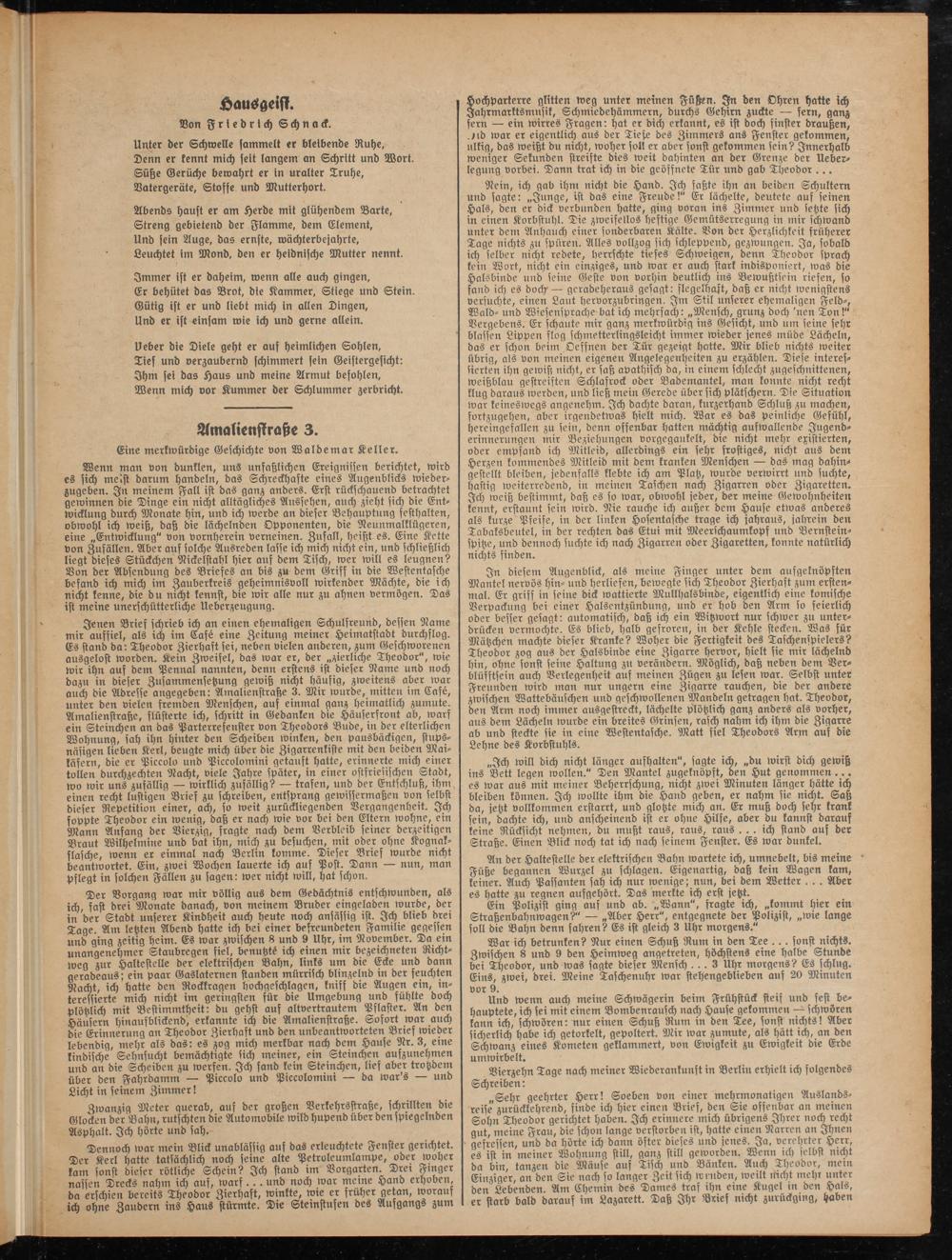 Der Vorgang war mir völlig aus dem Gedächtnis entschwunden, als ich, fast drei Monate danach, von meinem Bruder eingeladen wurde, der in der Stadt unserer Kindheit auch heute noch ansässig ist. Ich blieb drei Tage. Am letzten Abend hatte ich bei einer befreundeten Familie gegessen und ging zeitig heim. Es war zwischen 8 und 9 Uhr, im November. Da ein unangenehmer Staubregen fiel, benutzt^ ich einen mir bezeichneten Richtweg zur Haltestelle der elektrischen Bahn, links um die Ecke und dann geradeaus; ein paar Gaslaternen standen mürrisch blinzelnd in der feuchten Nacht, ich hatte den Rockkragen hochgeschlagen, kniff die Augen ein, interessierte mich nicht im geringsten für die Umgebung und fühlte doch plötzlich mit Bestimmtheit: du gehst aus altvertrautem Pflaster. An den Häusern hinausblickend, erkannte ich die Amalienstraße. Sofort war auch die Erinnerung an Theodor Zierhaft und den unbeantworteten Brief wieder lebendig, mehr als das: es zog mich merkbar nach dem Hause Nr. 3, eine kindische Sehnsucht bemächtigte sich meiner, ein Steinchen aufzunehmen und an die Scheiben zu werfen. Ich fand kein Steinchen, lies aber trotzdem über den Fahrdamm — Piccolo und Piccolomini — da war's — und Licht in seinem Zimmer!