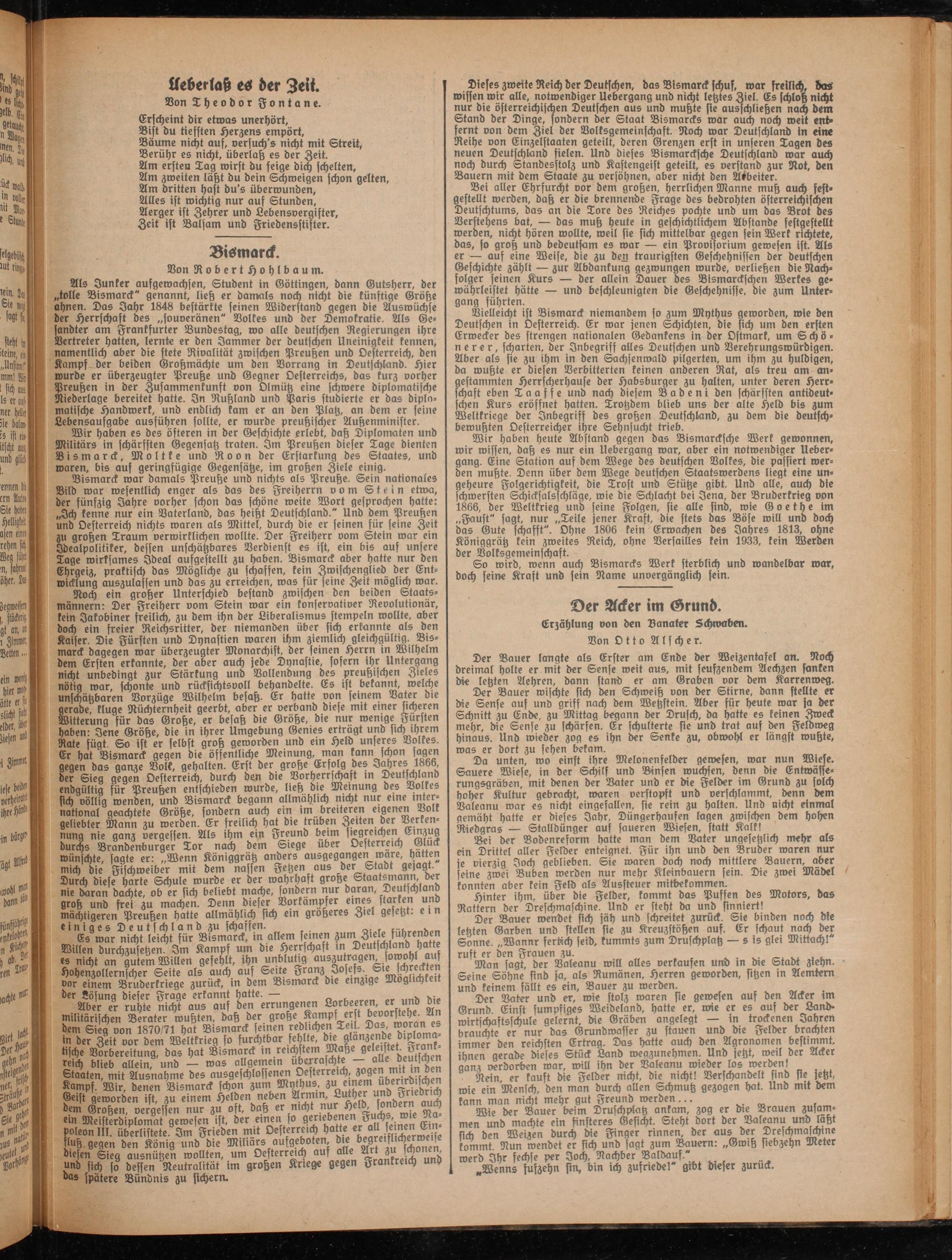 Bei aller Ehrfurcht vor dem großen, herrlichen Manne muh auch fest- gestellt werden, daß er die brennende Frage des bedrohten österreichischen Deutschtums, das an die Tore des Reiches pochte und um das Brot des Verstehens bat, — das muß heute in geschichtlichem Abstande festgestellt werben, nicht hören wollte, weil sie sich mittelbar gegen sein Werk richtete, das, so groß und bedeutsam es war — ein Provisorium gewesen ist. Als er — auf eine Weise, die zu den traurigsten Geschehnissen der deutschen Geschichte zählt — zur Abdankung gezwungen wurde, verließen die Nachfolger seinen Kurs — der allein Dauer des Bismarckschen Werkes gewährleistet hätte — und beschleunigten die Geschehnisse, die zum Untergang führten.