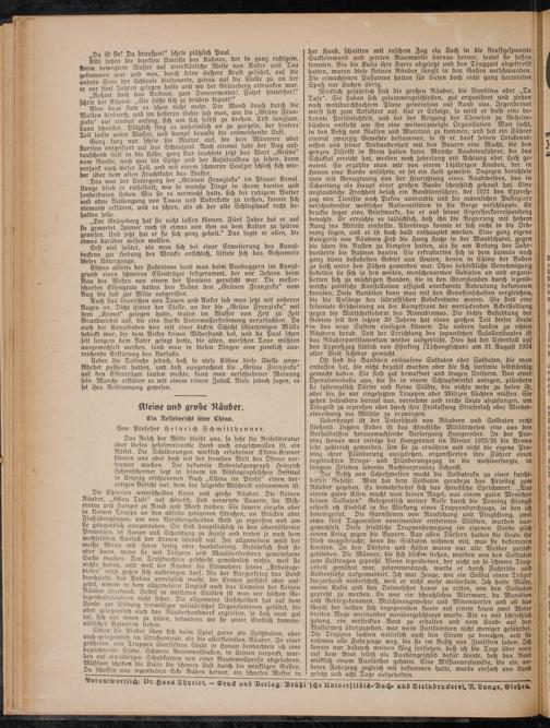 Das Reich der Mitte bleibt uns, so sehr die Reiseliteratur über dieses geheimnisvolle Land auch angeschwollen ist, ein Rätsel. Die Schilderungen wirklich erfahrener China-Kenner können uns aber doch mit der fremden Welt des Ostens vertrauter machen. Der bekannte Kolonialgeograph Heinrich Schmitthenner legt in seinem im Bibliographischen Institut in Leipzig erschienenen Buch „China im Profil" einen derartigen Bericht vor, dem der folgende Abschnitt entnommen ist. Die Chinesen unterscheiden kleine und große Räuber. Die kleinen Räuber, „Hsiau Tufe" auf chinesch, sind verarmte Bauern, die Mißernten und Hunger zu Raub und Mord treiben. Sie lauern einzeln oder in kleinen Trupps an den abseits gelegenen Straßen, an Brücken oder Mußübergängen, um von Vorübergehenden Geld zu erpressen und um sie gelegentlich auszurauben. Sie sind hauptsächlich in den übervölkerten Provinzen, in Honan und Schantung zu Hause und treten je nach dem wechselnden 'Ausfall der Ernten überall auf. Im allgemeinen wird der weihe Mann mit ihnen fertig oder handelseinig. Gefährlich sind sie aber dann, wenn sie mit Trägern und Maultiertreibern gemeinsame • *n°t*)en- 2)kn Troßknechten geschieht gewöhnlich nichts, weil sie