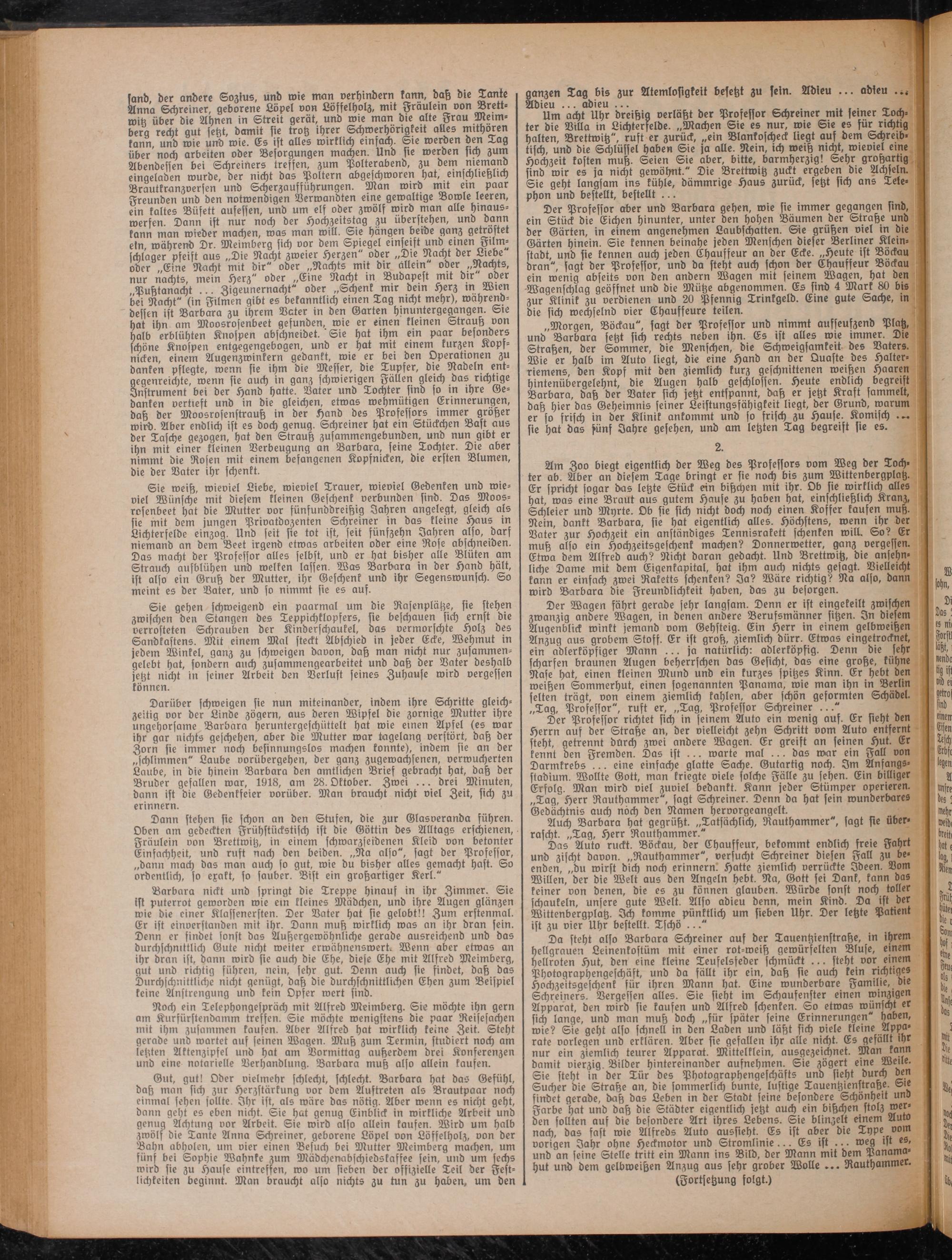 Da steht also Barbara Schreiner aus der Tauentzienskraße, in ihrem hellgrauen Leinenkostüm mit einer rot-weiß gewürfelten Bluse, einem hellroten Hut, den eine kleine Teufelsseder schmückt ... steht vor einem Photographengeschäst, und da fällt ihr ein, daß sie auch kein richtiges Hochzeitsgeschenk für ihren Mann hat. Ein« wunderbare Familie, die Schreiners. Vergeffen alles. Sic sieht im Schaufenster einen winzigen Apparat, den wird sie kaufen und Alfred schenken. Sa etwas wünscht er sich lange, und man muß doch „für später seine Erinnerungen" haben, wie? Sie geht also schnell in den Laden und läßt sich viele kleine Apparate vorlegen und erklären. Aber sie gefallen ihr alle nicht. Es gefällt ihr nur ein ziemlich teurer Apparat. Mittelklein, ausgezeichnet. Man kann damit vierzig. Bilder hintereinander aufnehmen. Sie zögert eine Weil«. Sie steht in der Tür des Photvgraphengefchäfts und sieht durch den Sucher die Straße an, die sommerlich bunte, luftige Tauentzienstraße. Sie findet gerade, daß das Leben in der Stadt feine besondere Schönheit und Farbe hat und daß die Städter eigentlich jetzt auch ein bißchen stolz werden sollten auf die besondere Art ihres Lebens. Sie blinzelt einem Auw nach, das fast wie Alfreds Auto aussieht. Es ist aber die Type vom vorigen Jahr ohne Heckmotor und Stromlinie... Es ist ... weg ist es, und an feine Stelle tritt ein Mann ins Bild, der Mann mit dem Panama- Hut und dem gelbweißen Anzug aus sehr grober Wolle ... Rauthammer.