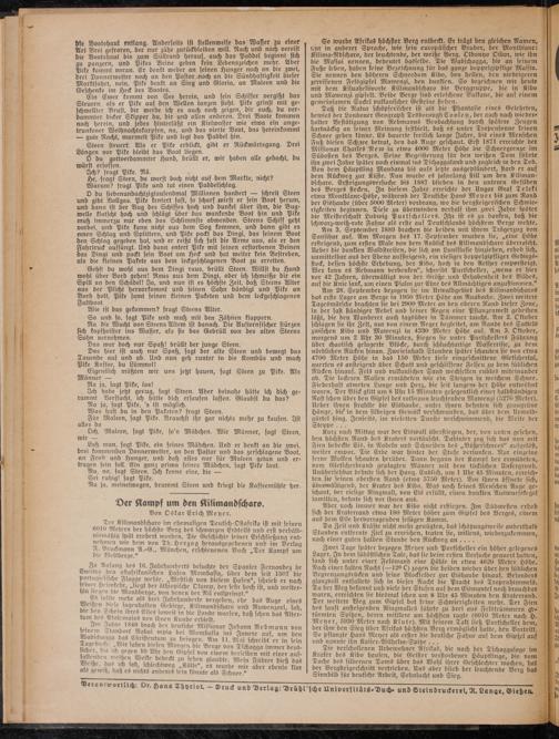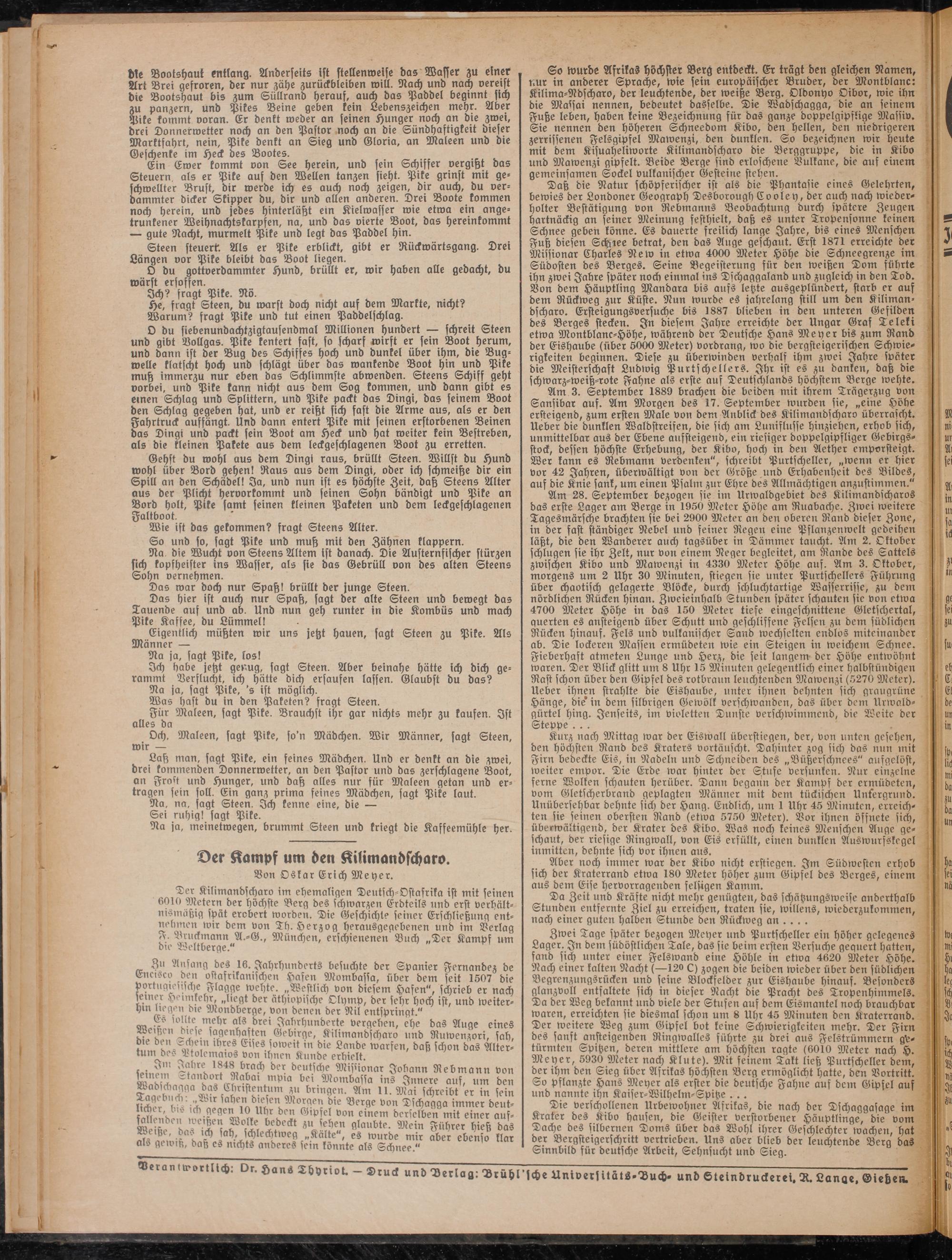 Der Kilimandscharo im ehemaligen Deutsch-Ostasrika ist mit seinen 6010 Metern bet höchste Berg des schwarzen Erdteils und erst verhältnismäßig spät erobert worden. Die Geschichte seiner Erschließung entnehmen wir dem von Th. Herzog herausgegebenen und im Verlag 5v. Bruckmann A.-G., München, erschienenen Buch „Der Kamps um d,e Weltberge."