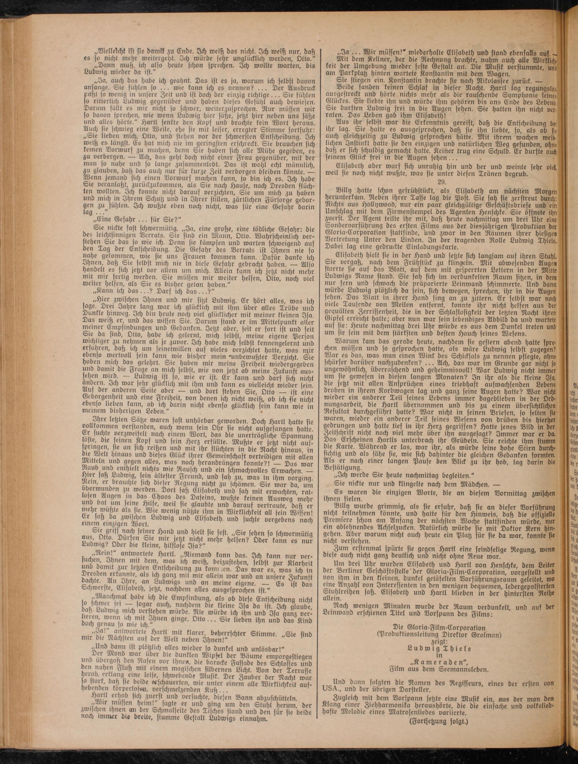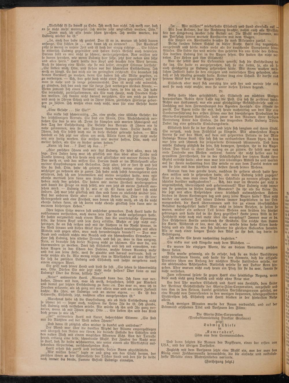 Billy hatte schon gefrühstückt, als Elisabeth am nächsten Morgen herunterkam. Neben ihrer Tasse lag die Post. Sie sah sie zerstreut durchs Nichts aus Hollywood, nur ein paar gleichgültige Geschäftsbriefe und ein Umfdjlag mit dem Firmenstempel des Agenten Herrschte. Sie öffnete ihn zuerst. Der Agent teilte ihr mit, daß heute nachmittag um drei Uhr eine Sonderoorführung des ersten Films aus der diesjährigen Produktion der Gloria-Eorporation stattfinde, und zwar in den Räumen ihrer hiesigen Vertretung Unter den Linden. In der tragenden Rolle Ludwig Thiele. Dabei lag eine gedruckte Einladungskarte.