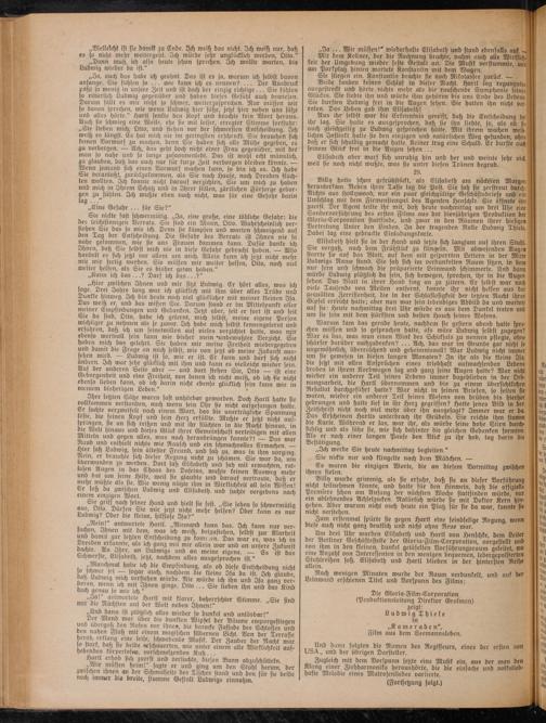 Elisabeth hielt sie in der Hand und setzte sich langsam auf ihren Stuhl. Sie vergaß, nad) dem Frühstück zu kling-eln. Mit abwesenden Augen starrte sie auf das Blatt, auf dem mit gesperrten Lettern in der Mitte Ludwigs Name stand. Sie sah sich im verdunkelten Raum sitzen, in dem nur fern und schwach die präparierte Leinwand schimmerte. Und bamt würde Ludwig plötzlich da fein, sich bewegen, sprechen, ihr in die Augen sehen. Das Blatt in ihrer Hand fing an zu zittern. Er selbst war noch viele Tausende von Meilen entfernt, konnte ihr nicht helfen aus der geguülten Zerrissenheit, die in der Schlaflosigkeit der letzten Nacht ihren Gipfel erreicht hatte: aber nun war fein lebendiges Abbild da und wartet! auf sie: Heute nachmittag drei Uhr würde es aus dem Dunkel treten unb um sie fein mit dem stärksten und besten Hauch seines Wesens.