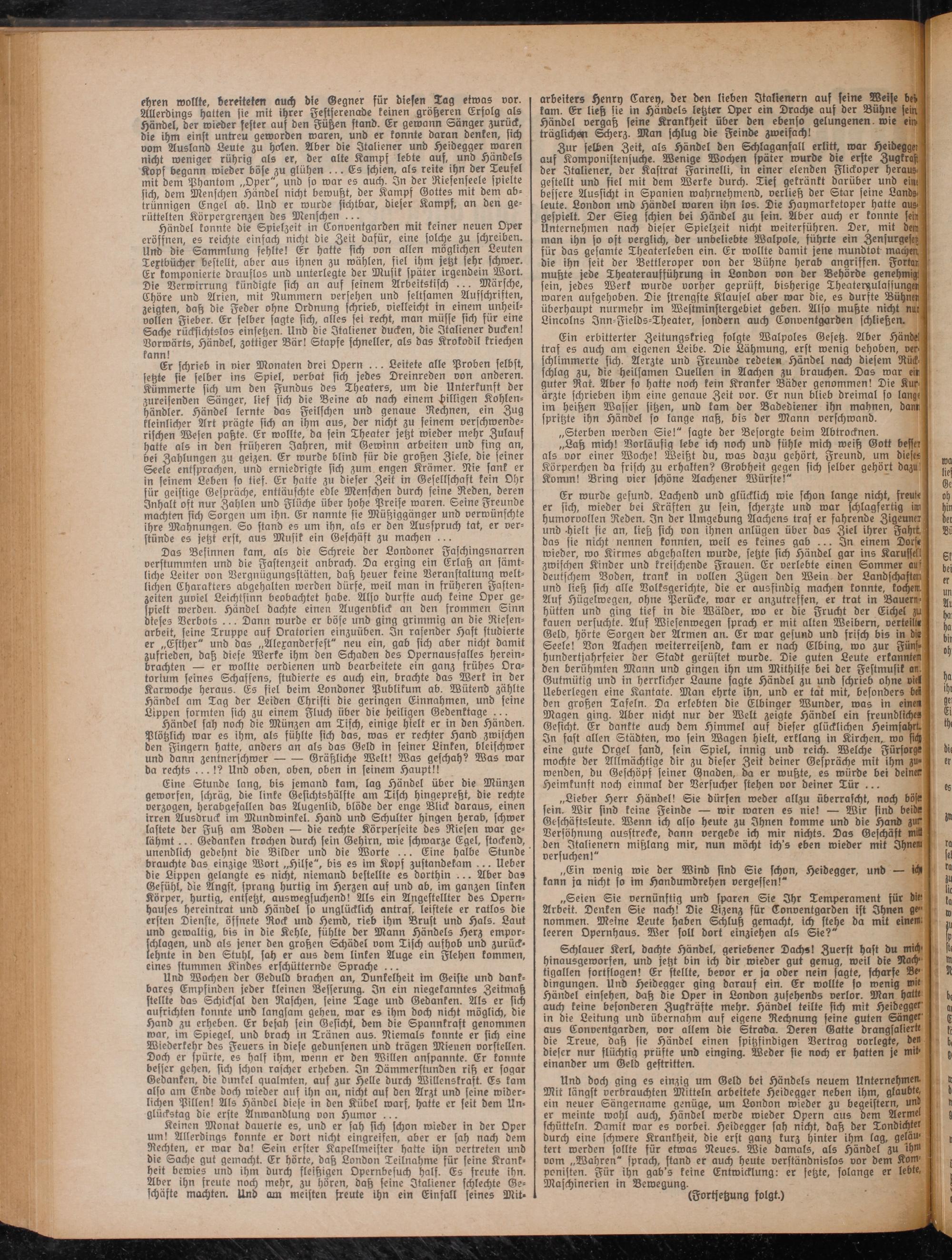 Er schrieb in vier Monaten drei Opern ... Leitete alle Proben selbst, setzte sie selber ins Spiel, verbat sich jedes Dreinreden von anderen. Kümmerte sich um den Fundus des Theaters, um die Unterkunft der zureifenden Sänger, lief sich die Beine ab nach einem Hilligen Kohlenhändler. Händel lernte dos Feilschen und genaue Rechnen, ein Zug kleinlicher Art prägte sich an ihm aus, der nicht zu seinem verschwenderischen Wesen paßte. Er wollte, da sein Theater jetzt wieder mehr Zulauf hatte als in den früheren Jahren, mit Gewinn arbeiten und fing an, bei Zahlungen zu geizen. Er wurde blind für die großen Ziele, die seiner Seele entsprachen, und erniedrigte sich zum engen Krämer. Nie sank er in seinem Leben so tief. Er hatte zu dieser Zeit in Gesellschaft kein Ohr für geistige Gespräche, enttäuschte edle Menschen durch seine Reden, deren Inhalt oft nur Zahlen und Fluche über hohe Preise waren. Seine Freunde machten sich Sorgen um ihn. Er nannte sie Müßiggänger und verwünschte ihre Mahnungen. So stand es um ihn, als er den Ausspruch tat, er verstünde es jetzt erst, aus Musik ein Geschäft zu machen ...