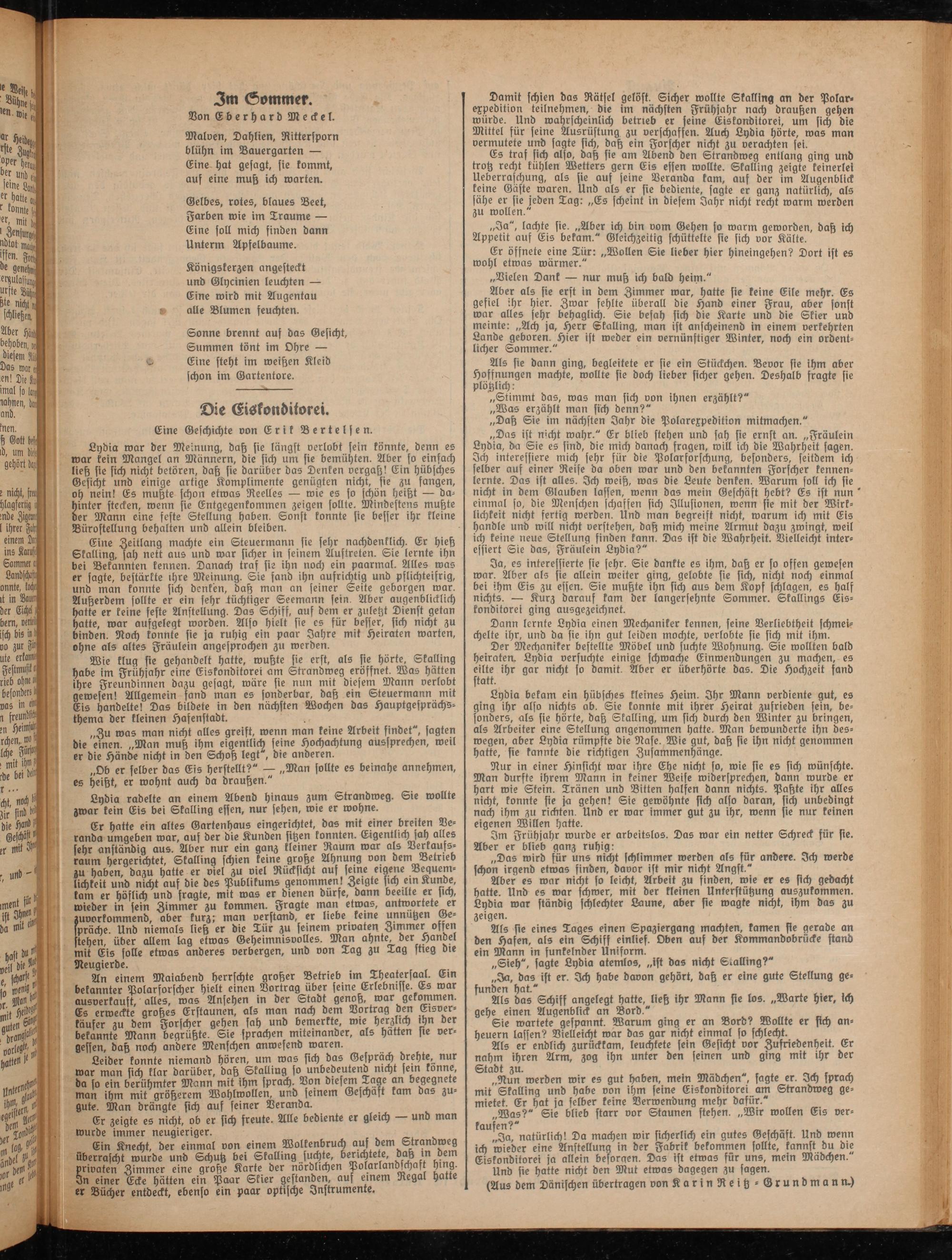 An einem Maiabend herrschte großer Betrieb im Theatersaal. Em bekannter Polarforscher hielt einen Vortrag über seine Erlebnisse. Es war ausverkaust alles, was Ansehen in der Stadt genoß, war gekommen. Es erweckte großes Erstaunen, als man nach dem Dortrag Den Eisverkäufer zu dem Forscher gehen sah und bemerkte, wie herzlich ihn der bekannte Mann begrüßte. Sie sprachen miteinander, als hatten sie vergessen, daß noch andere Menschen anwesend waren.