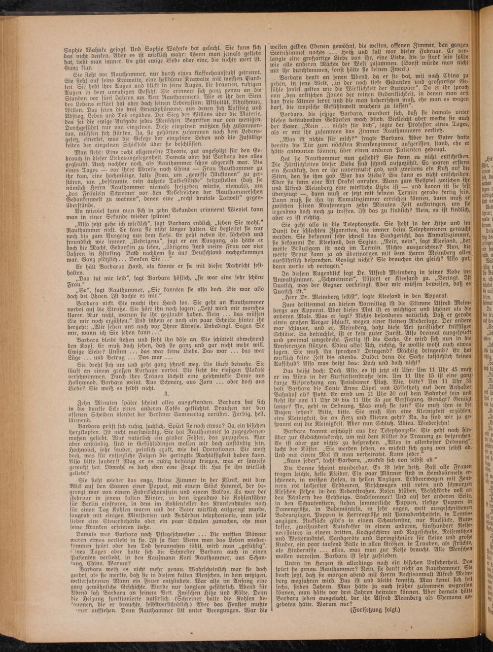Man sieht: Eine recht allgemeine Theorie, gut angespitzt für den Gebrauch in dieser Liebesangelegenheit. Damals aber hat Barbara das alles geglaubt. Auch nachher noch, als Rauthammer schon abgereist war. Bis eines Tages — vor ihrer Abreise nach China — Frau Rauthammer zu ihr kam, eine hochmütige, kalte Frau, um „gewisse Illusionen" zu zerstören, um „bestimmte, rein äußere Tatbestände" festzustellen (daß sie nämlich Herrn Rauthammer niemals freigeben würde, niemals), um , das Fräulein Schreiner vor den Neb'elreichen der Rauthammerschen Gedankenwelt zu warnen", denen eine „recht brutale Tatwelt" gegen-
