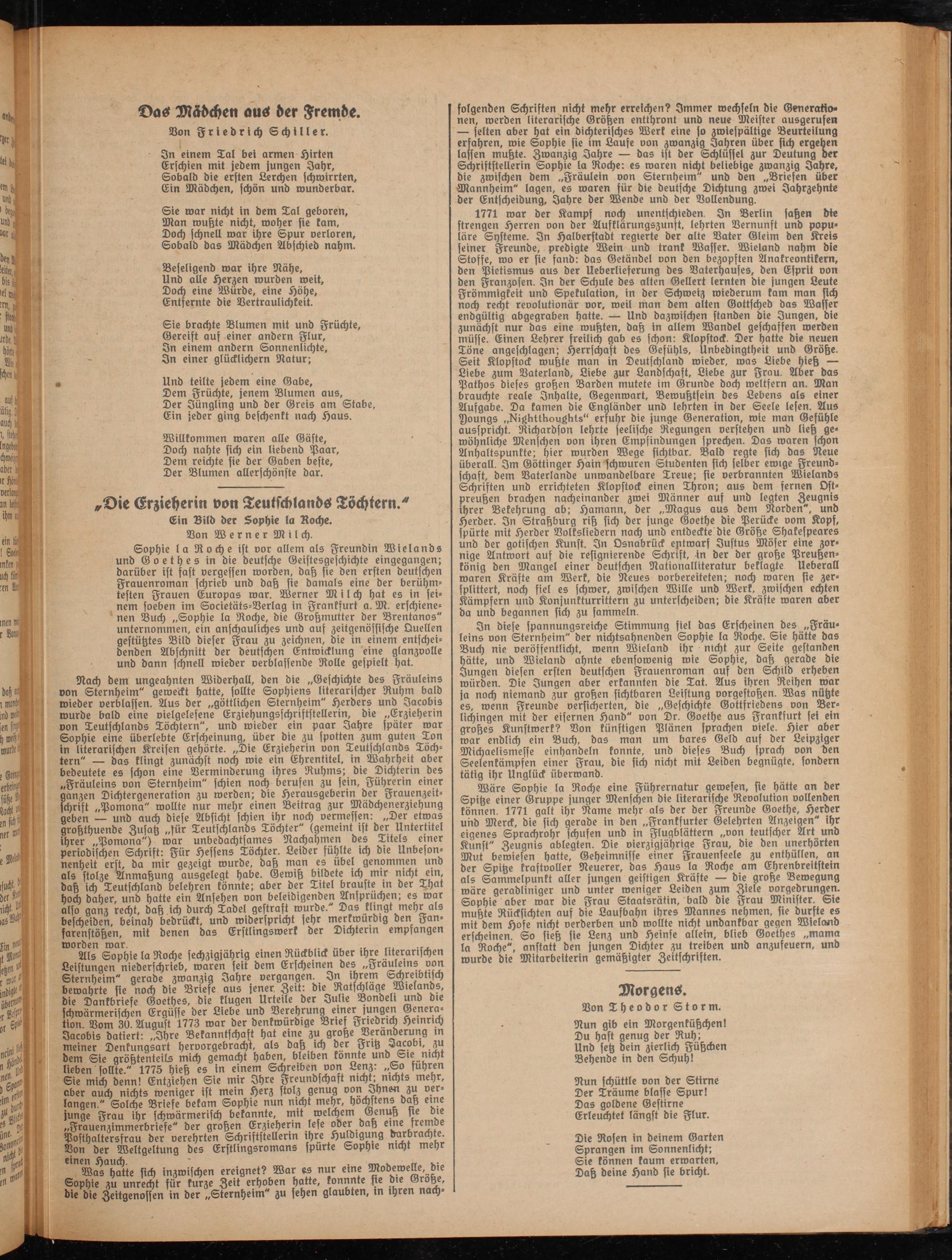 aber auch nichts weniger ist mein Herz stolz genug von Ihnen zu verlangen." Solche Briefe bekam Sophie nun nicht mehr, höchstens daß eine junge Frau ihr schwärmerisch bekannte, mit welchem Genuß sie die „Frauenzimmerbriefe" der großen Erzieherin lese oder daß eine fremde Posthaltersfrau der verehrten Schriftstellerin ihre Huldigung d^brachte. Von der Weltgeltung des Erstlingsromans spürte Sophie nicht mehr einen Hauch. ' , ™
