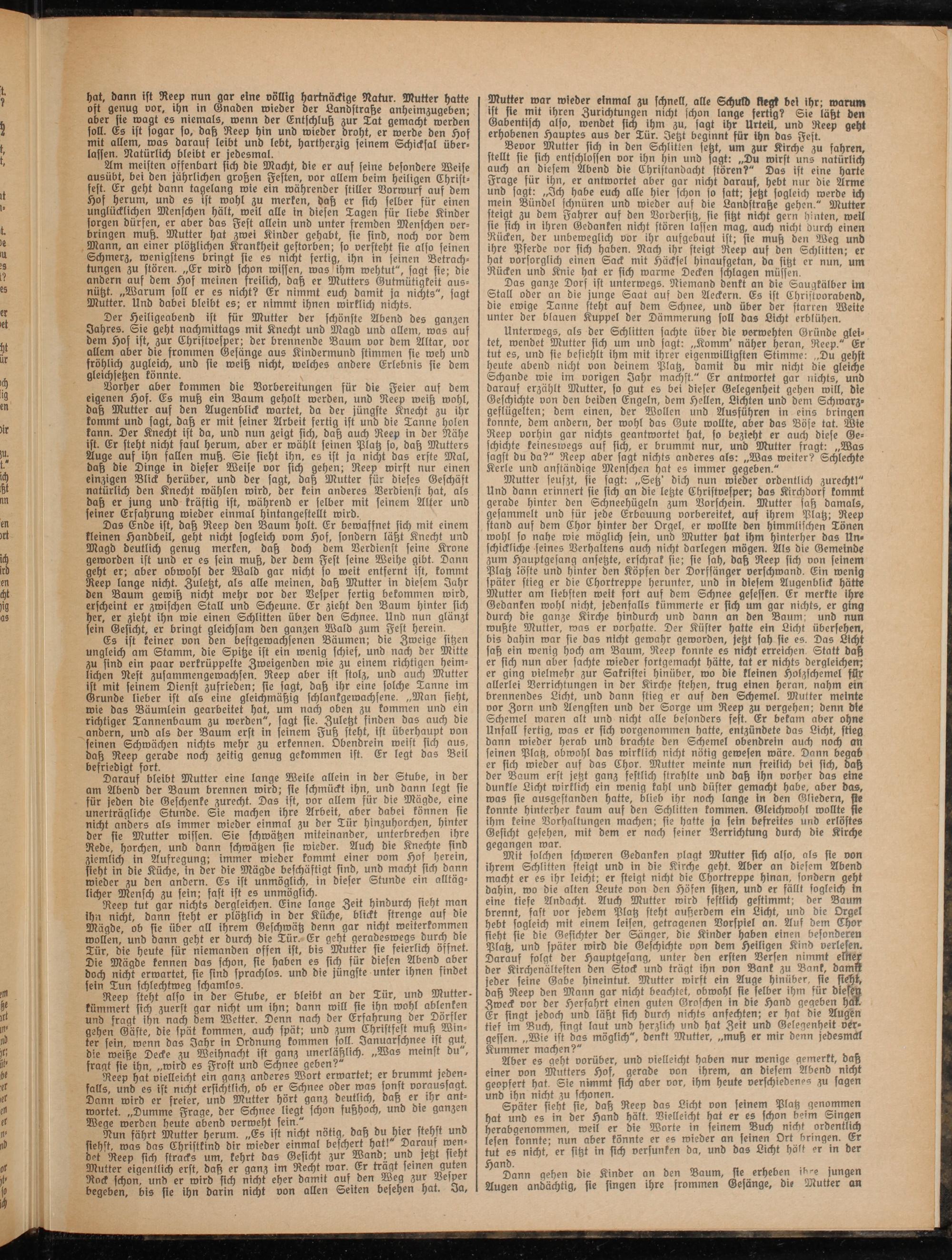 Später sieht sie, daß Reep das Licht von seinem Platz genommen hat und es in der Hand hält. Vielleicht hat er es schon beim Gingen herabgenomrnen, weil er die Worte in seinem Buch nicht ordentlich lesen konnte; nun aber konnte er es wieder an seinen Ort bringen. Er tut es nicht, er sitzt in sich versunken da, und das Licht hält er in der ^Donn gehen die Kinder an den Baum, ste erheben ib-e jungen Augen andächtig, sie fingen ihre frommen Gesänge, die Mutter cm