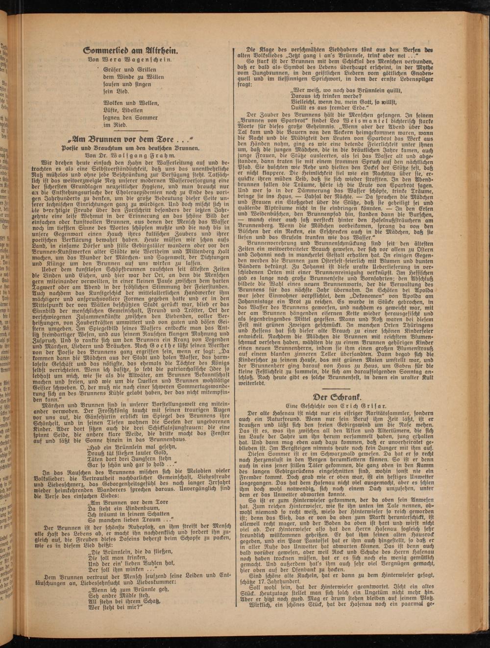 So stark ist der Brunnen mit dem Schicksal des Menschen verbunden, daß er bald als- Symbol des Lebens überhaupt erscheint, in der Mythe vom Jungbrunnen, in den geistlichen Liedern vom göttlichen ©naben» quell und im tiefsinnigen Sprichwort, in dem der ernste Lebenspilger fragt: