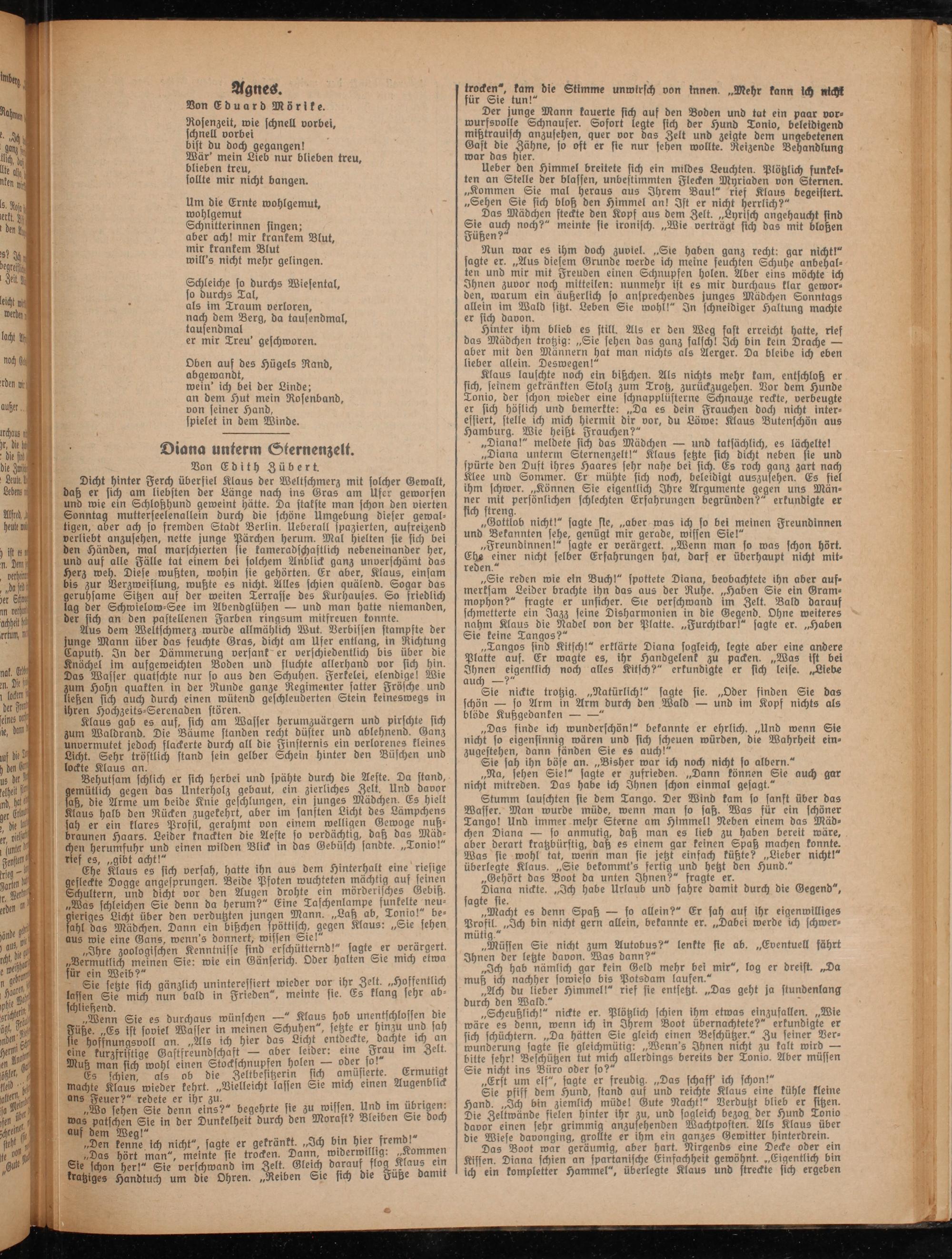 Dicht hinter Ferch übersiel Klaus der Weltschmerz mit solcher Gewalt, daß er sich am liebsten der Länge nach ins Gras am Ufer geworsen und wie ein Schloßhund geweint hätte. Da stakste man schon den vierten Sonntag mutterseelenallein durch die schöne Umgebung dieser gewaltigen, aber ach so fremden Stadt Berlin. Ueberall spazierten, aufreizend verliebt anzusehen, nette junge Pärchen herum. Mal hielten sie sich bei den Händen, mal marschierten sie kameradschastlich nebeneinander her, und auf alle Fälle tat einem bei solchem Anblick ganz unverschämt das Herz weh. Diese wußten, wohin sie gehörten. Er aber, Klaus, einsam bis zur Verzweiflung, wußte es nicht. Alles schien quälend. Sogar das geruhsame Sitzen auf der weiten Terrasse des Kurhauses. So friedlich lag der Schwielow-See im Abendglühen — und man hatte niemanden, der sich an den pastellenen Farben ringsum mitsreuen konnte.