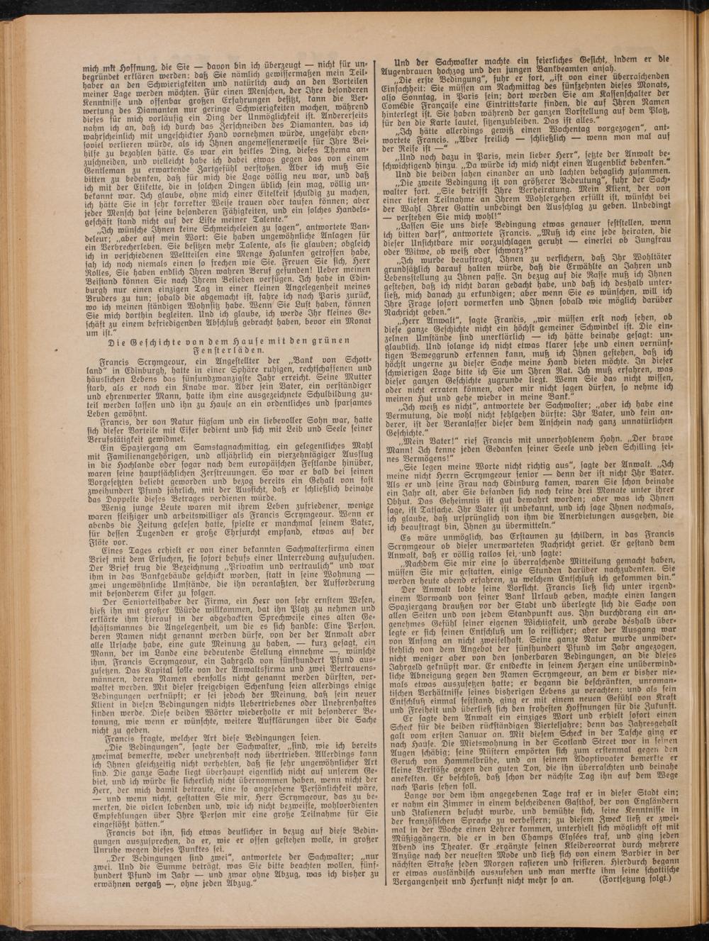 Francis Scrymgeour, ein Angestellter der „Bank von Schottland" in Edinburgh, halte in einer Sphäre ruhigen, rechtschaffenen und häuslichen Gebens das fünfundzwanzigste Jahr erreicht. Seine Mutter starb, als er noch ein Knabe war. Aber fein Vater, ein verständiger und ehrenwerter Mann, hatte ihm eine ausgezeichnete Schulbildung zuteil werden laffen und ihn zu Hause an ein ordentliches und sparsames Geben gewöhnt. „ ~ . ,,