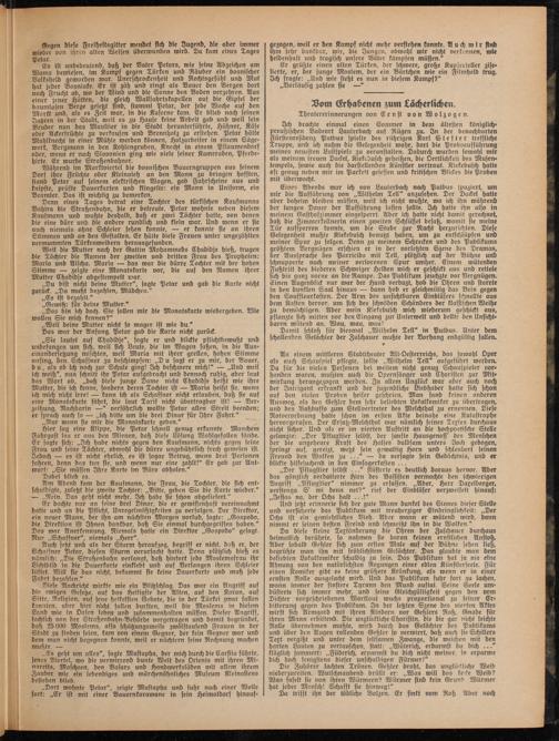 Und jetzt erinnerte sich der gute Mann dunkel des Sinnes dieser Stelle und versicherte das Publikum mit treuherziger Eindringlichkeit: „Der Ochs ist ein gemiehtliches Vieh. Aber wann er wütend wird, bann nimmt er feinen besten Fremd und schmeißt ihn in die Wolken."