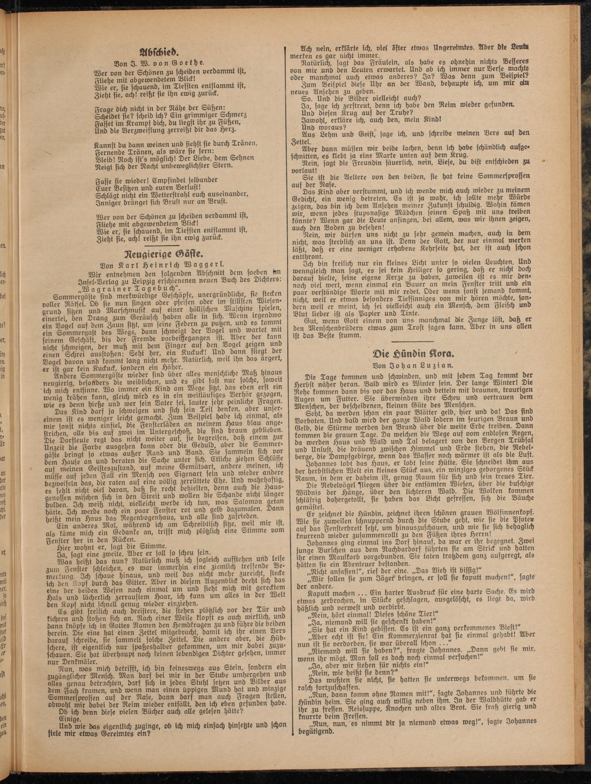 Johannes ging einmal ins Dorf hinauf, da war er ihr begegnet. Zwei junge Burschen aus dem Nachbardorf führten sie am Strick unb hatten ihr einen Maulkorb oorgebunben. Sie taten trotzbem ganz aufgeregt, als hätten sie ein Abenteuer bestauben.