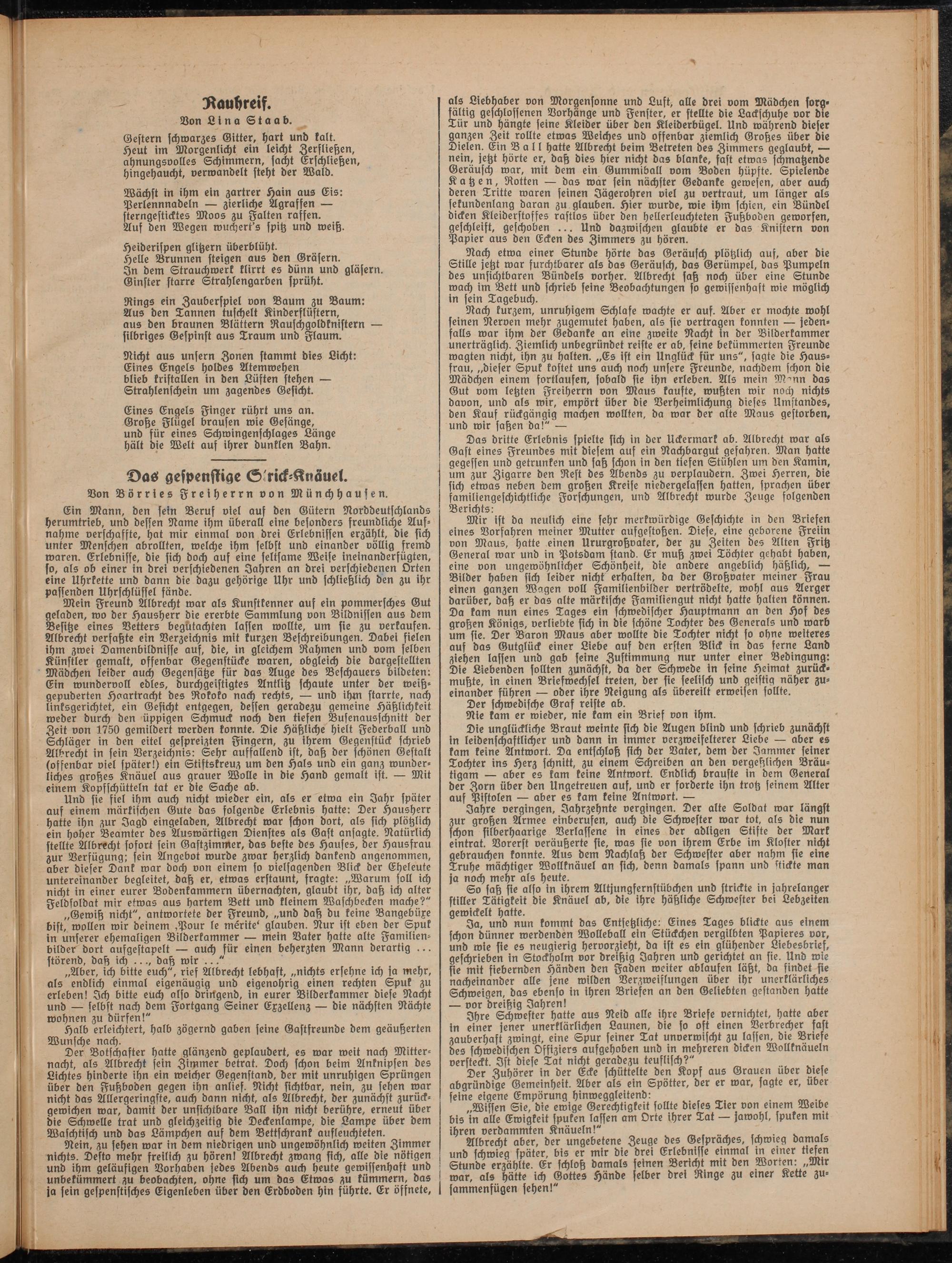 „Gewiß nicht", antwortete der Freund, „und daß du keine Bangebüxe bist, wollen wir deinem ,Pour le merke' glauben. Nur ist eben der Spuk in unserer ehemaligen Bilderkammer — mein Vater hatte alte Familienbilder dort aufgestapelt — auch für einen beherzten Mann derartig ... störend, daß ich ..., daß wir ..."