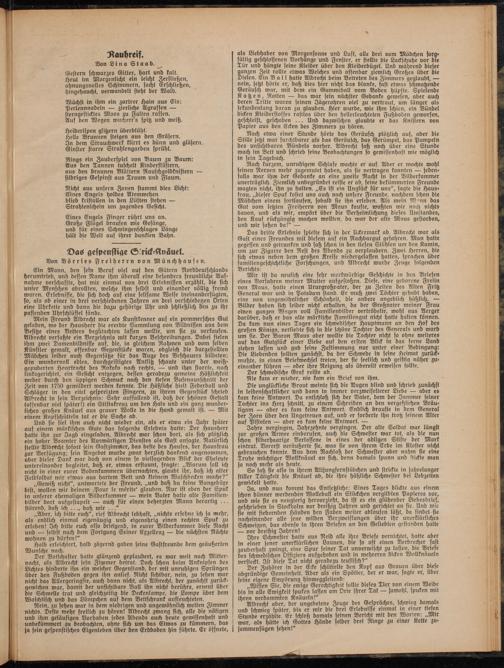 Nach kurzem, unruhigem Schlafe wachte er auf. Aber er mochte wohl feinen Nerven mehr zugemutet haben, als sie vertragen konnten — jedenfalls war ihm der Gedanke an eine zweite Nacht in der Bilderkammer unerträglich. Ziemlich unbegründet reifte er ab, feine bekümmerten Freunde wagten nicht, ihn zu halten. „Es ist ein Unglück für uns", sagte die Hausfrau, „dieser Spuk kostet uns auch noch unsere Freunde, nachdem schon die Mädchen einem fortlaufen, sobald sie ihn erleben. Als mein M^mi das Gut vorn letzten Freiherrn von Maus kaufte, wußten wir noch nichts davon, und als wir, empört über die Verheimlichung dieses Umstandes, den Kauf rückgängig machen wollten, da war der alte Maus gestorben, und wir saßen da!" —