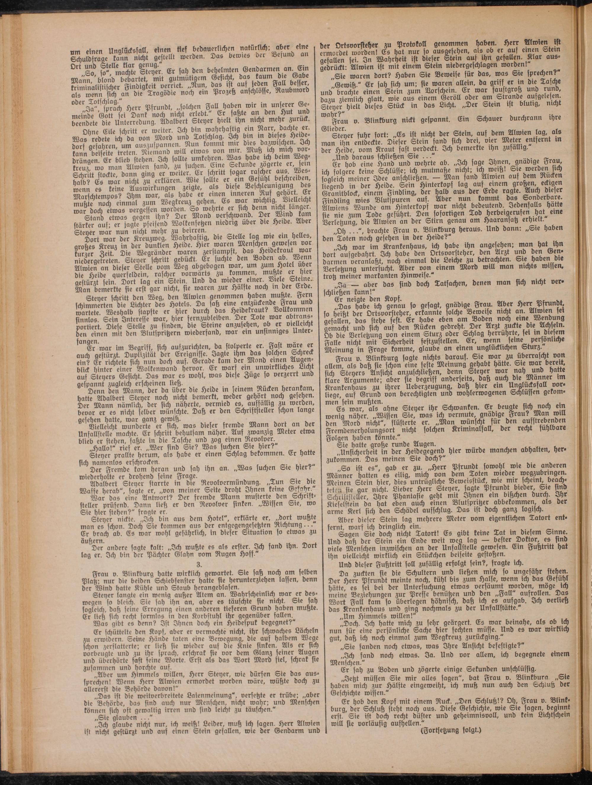 ^"grQU v. Blinkburg nickt gespannt. Ein Schauer durchrann ihre @l'stener suhr fort: „Es ist nicht der Stein, auf dem Alwien lag, als man ihn entdeckte. Dieser Stein sand sich drei, vier Meter entfernt iN der Heide, vom Kraut fast verdeckt. Ich bemerkte ihn zufällig.