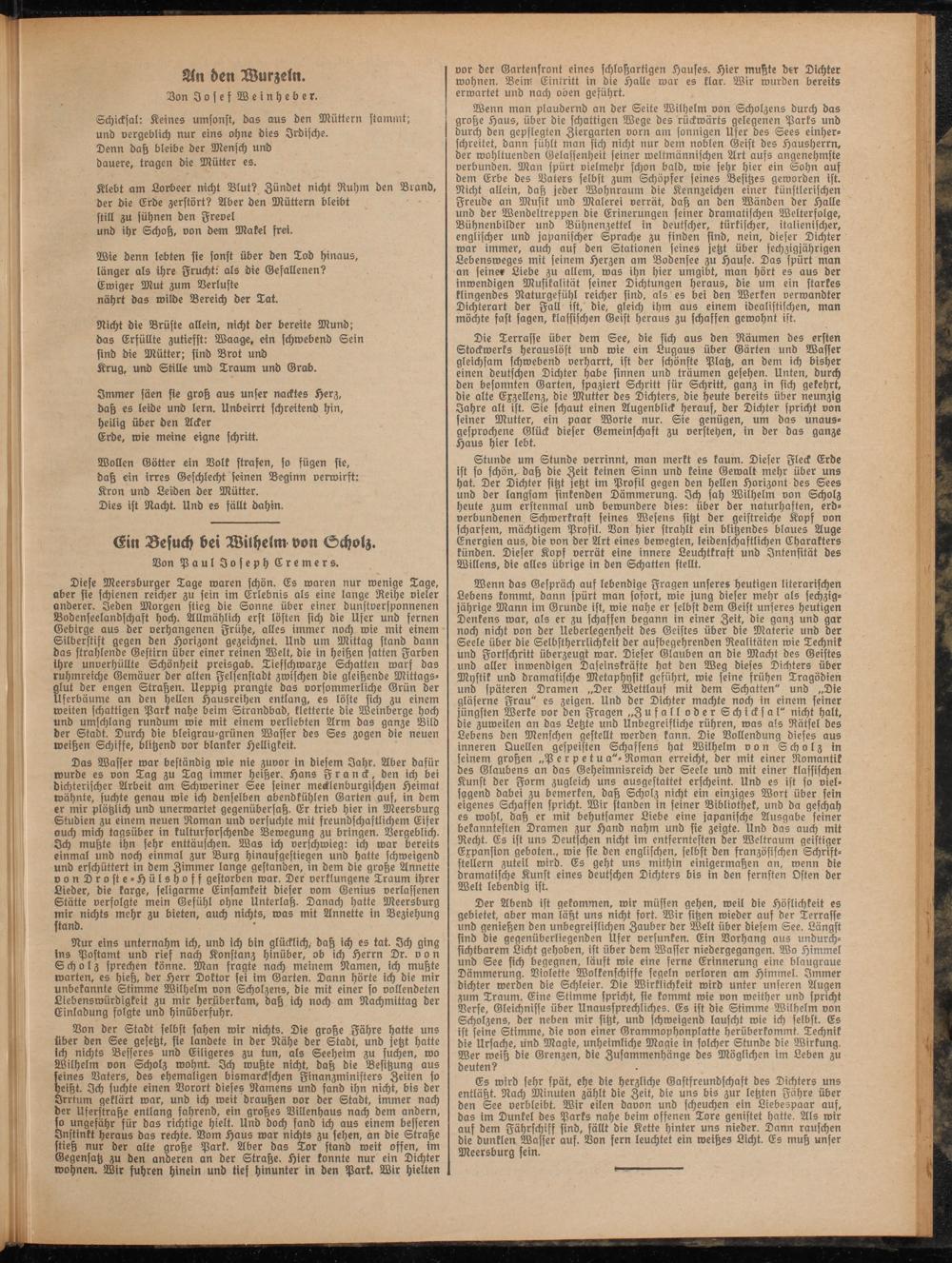 Wenn man plaudernd an der Seite Wilhelm von Scholzens durch das große Haus, über die schattigen Wege des rückwärts gelegenen Parks und durch den gepflegten Ziergarten vorn am sonnigen Ufer des Sees einherschreitet, dann fühlt man sich nicht nur dem noblen Geist des Hausherrn, der wohltuenden Gelassenheit seiner weltmännischen Art aufs angenehmste verbunden. Man spürt vielmehr schon bald, wie sehr hier ein Sohn auf dem Erbe des Vaters selbst zum Schöpfer seines Besitzes geworden ist. Nicht allein, daß jeder Wohnraum die Kennzeichen einer künstlerischen Freude an Musik und Malerei verrät, daß an den Wänden der Halle und der Wendeltreppen die Erinerungen seiner dramatischen Welterfolge, Bühnenbilder und Bühnenzettel in deutscher, türkischer, italienischer, englischer und japanischer Sprache zu finden sind, nein, dieser Dichter war immer, auch auf den Stationen seines jetzt über sechzigjährigen Lebensweges mit seinem Herzen am Bodensee zu Hause. Das spürt man an seine« Liebe zu allem, was ihn hier umgibt, man hört es aus der inwendigen Musikalität seiner Dichtungen heraus, die um ein starkes klingendes Naturgefühl reicher sind, als es bei den Werken verwandter Dichterart der Fall ist, die, gleich ihm aus einem idealistischen, man möchte fast sagen, klassischen Geist heraus zu schaffen gewohnt ist.