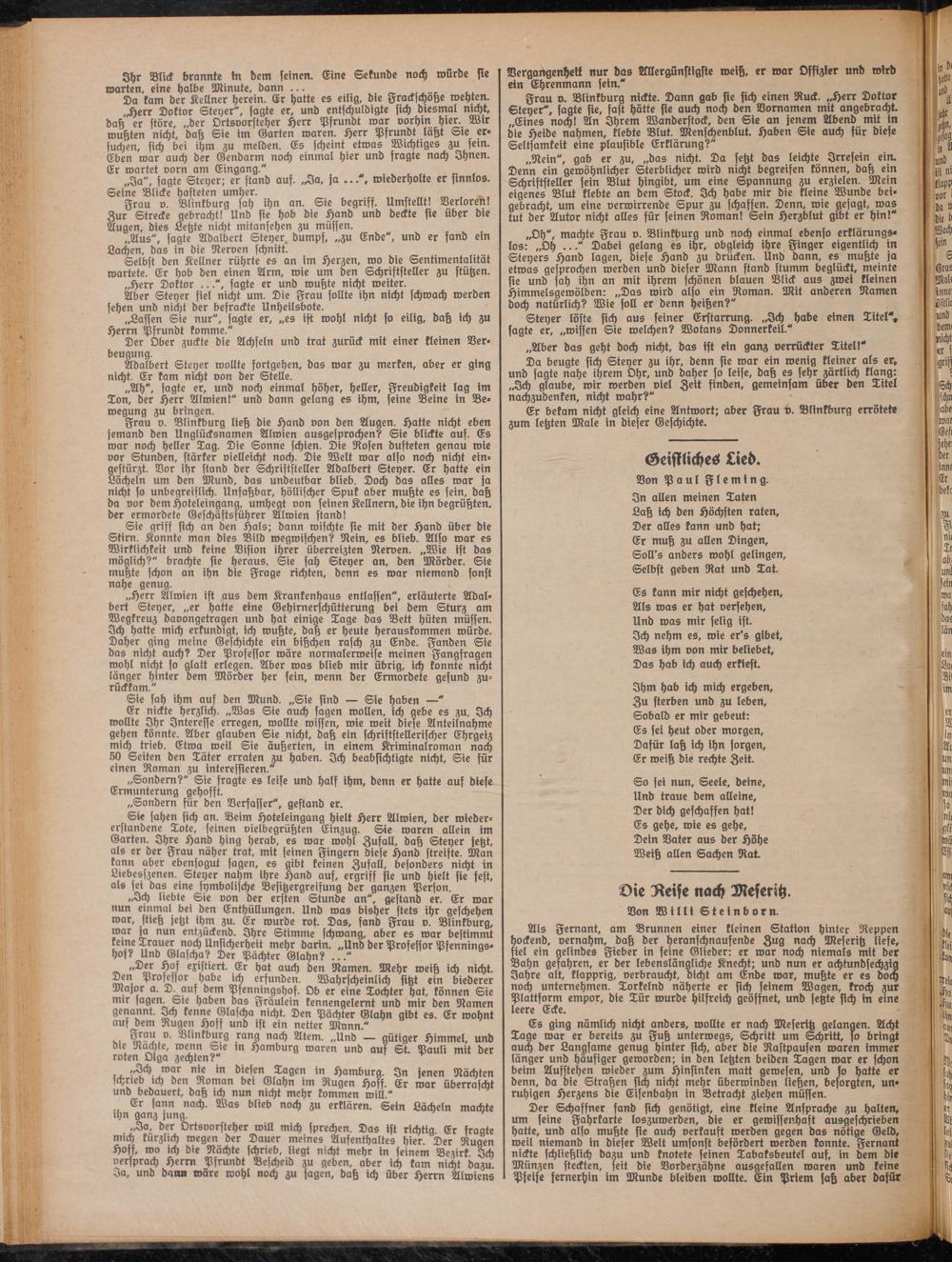 Frau v. Blinkburg ließ die Hand von den Augen. Hatte nicht eben jemand den Unglücksnamen Alwien ausgesprochen? Sie blickte auf. Cs war noch heller Tag. Die Sonne schien. Die Rosen dufteten genau wie vor Stunden, stärker vielleicht noch. Die Welt war also noch nicht ein- aestürzt. Vor ihr stand der Schriftsteller Adalbert Steyer. Er hatte ein Lächeln um den Mund, das undeutbar blieb. Doch das alles war ja nicht so unbegreiflich. Unfaßbar, höllischer Spuk aber mußte es fein, daß da vor dem Hoteleingang, umhegt von seinen Kellnern, die ihn begrüßten, der ermordete Geschäftsführer Alwien stand!