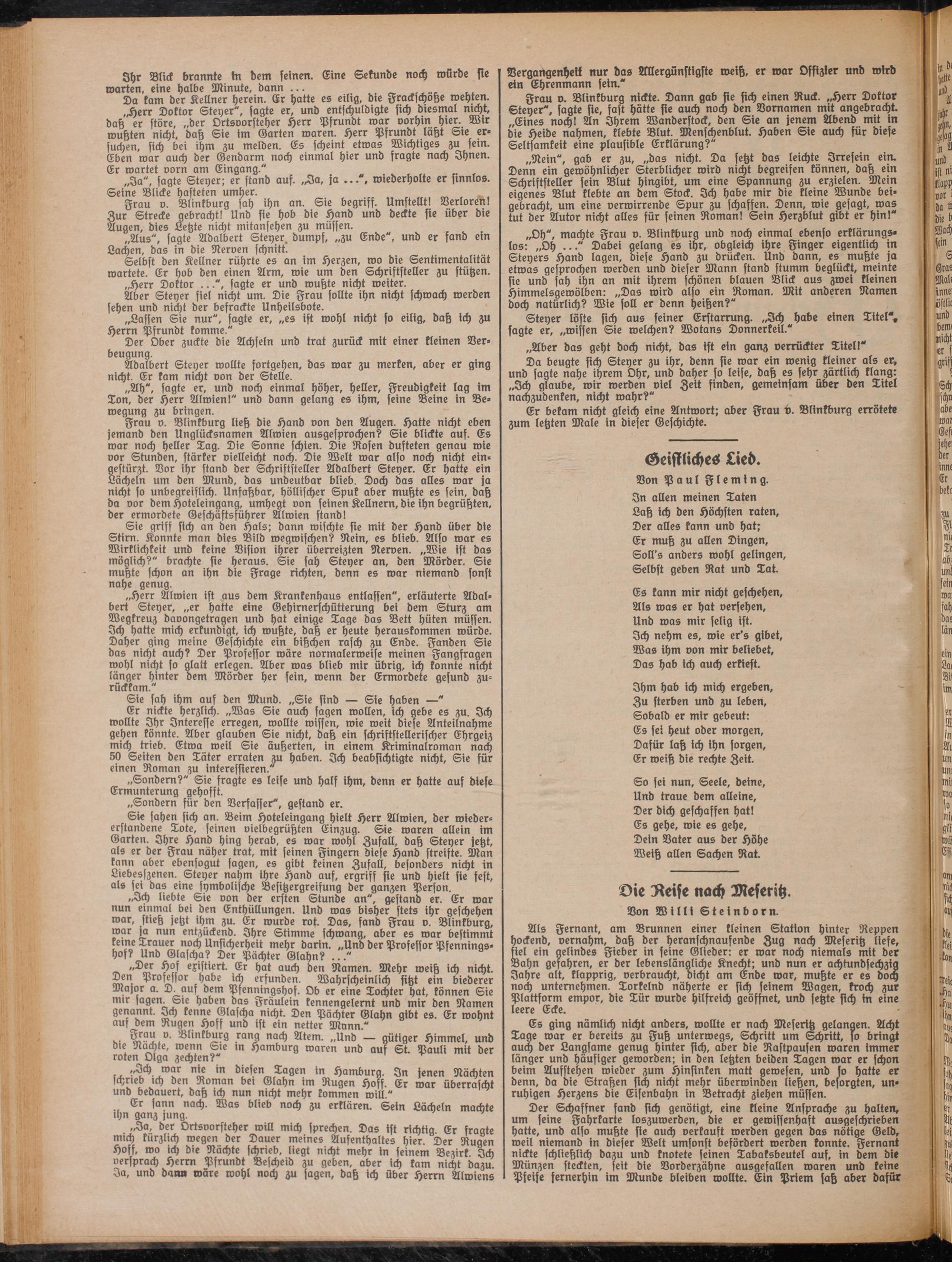 ,Herr Doktor Steyer", sagte er, und entschuldigte sich diesmal nicht, daß er störe, „der Ortsvorsteher Herr Pfrundt war vorhin hier. Wir wußten nicht, daß Sie im Garten waren. Herr Pfrundt läßt Sie ersuchen, sich bei ihm zu melden. Es scheint etwas Wichtiges zu fern. Eben war auch der Gendarm noch einmal hier und fragte nach Ihnen. Er wartet vorn am Eingang."