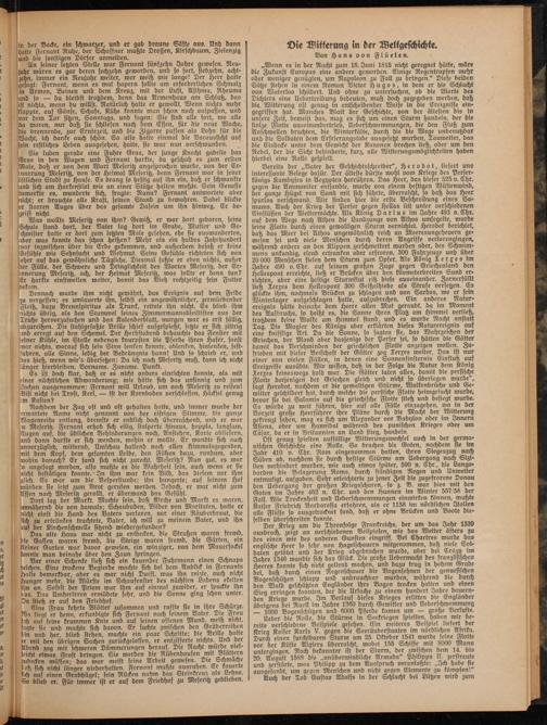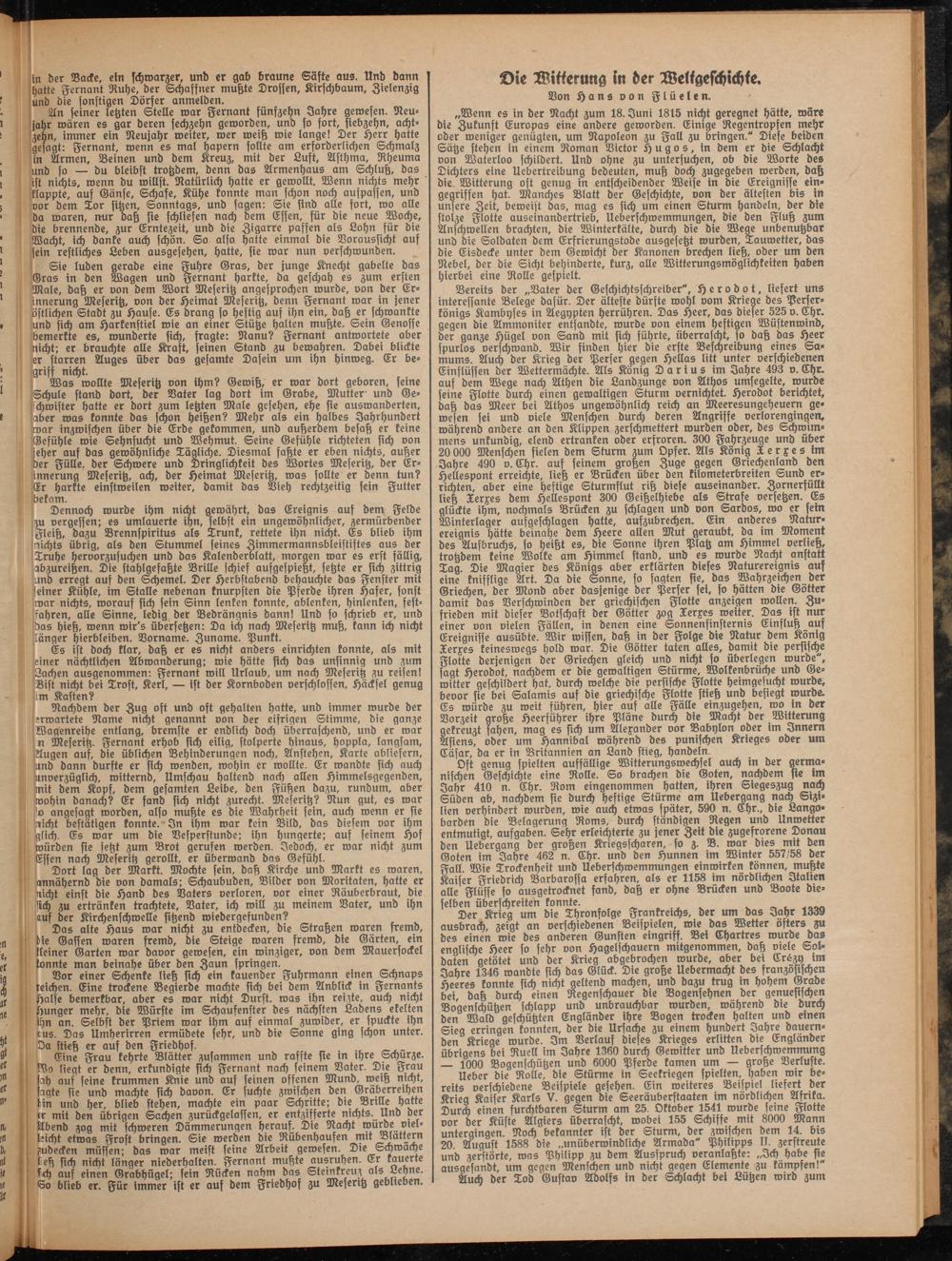 „Wenn es in der Nacht zum 18. Juni 1815 nicht geregnet hätte, wäre die Zukunft Europas eine andere geworden. Einige Regentropfen mehr oder weniger genügten, um Napoleon zu Fall zu bringen." Diese beiden Sätze stehen in einem Roman Victor Hugos, in bem er bie Schlacht von Waterloo schilbert. Unb ohne zu untersuchen, ob bie Worte bes Dichters eine Uebertreibung bebeuten, muß boch zugegeben werben, baß bie Witterung oft genug in entfcheibenber Weife in bie Ereignisse eingegriffen hat. Manches Blatt ber Geschichte, von der ältesten bis in unsere Zeit, beweist bas, mag es sich um einen Sturm hanbeln, ber bie stolze Flotte auseinanbertrieb, Ueberschwemmungen, bie ben Fluß zum Anschwellen brachten, bie Winterkälte, burch bie bie Wege unbenutzbar unb bie Solbaten bem Erfrierungstobe ausgesetzt würben, Tauwetter, bas bie Eisbecke unter bem Gewicht ber Kanonen brechen ließ, ober um ben Nebel, ber bie Sicht dehinberte, kurz, alle Witterungsmöglichkeiten haben hierbei eine Rolle gespielt.