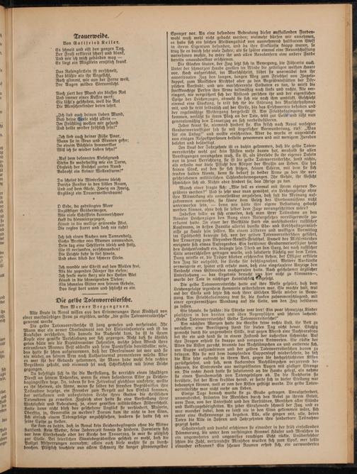 Die gelbe Totenvorreitersche ist jung gewesen und verheiratet. Ihr Mann war ein armer Oberleutnant von der Linieninsanterie und ist im Kaukasus verschollen. Als damals die Nachricht kam, da ist in ihrem Kopfe eine gcwisie Verschiebung vor sich gegangen. Nicht daß sie ähnlich getan hätte wie die Kapitänswitwe Johanson, welche jeden Abend ihres ertrunfenen SDlnnnes 23ett cibbecttc uni) (eine Pantoffeln bereitftetlte, nein, das hatte sie schon ausgenommen, daß der Oberleutnant tot war und sie nie wieder an seinem Arm nach Katharinental promenieren wurde. Aber es war ihr der Gedanke gekommen, ihr Mann habe wohl kein rechtes Begräbnis gehabt, und niemand sei nach Schicklichkeit mit seiner Leiche gegangen.