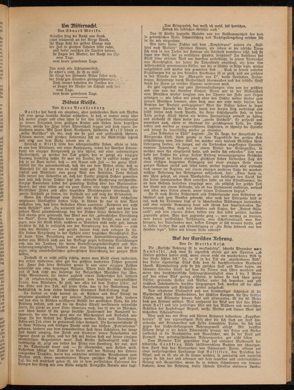 s- s tolägt der Dichter in dieser mit der Rettung des Lebens endigenden Tragödie, darin das nüchterne militärische Preußentum zum Mythos wird, einen wunderbaren Bogen zwischen Gesetz und freier Xat, Die erst wahrhaft getan ist, als in dem persönlichen Opfermut des Prinzen das Gesetz wie eine Blüte ausgeht. Prinzessin Natalie aber sagt: