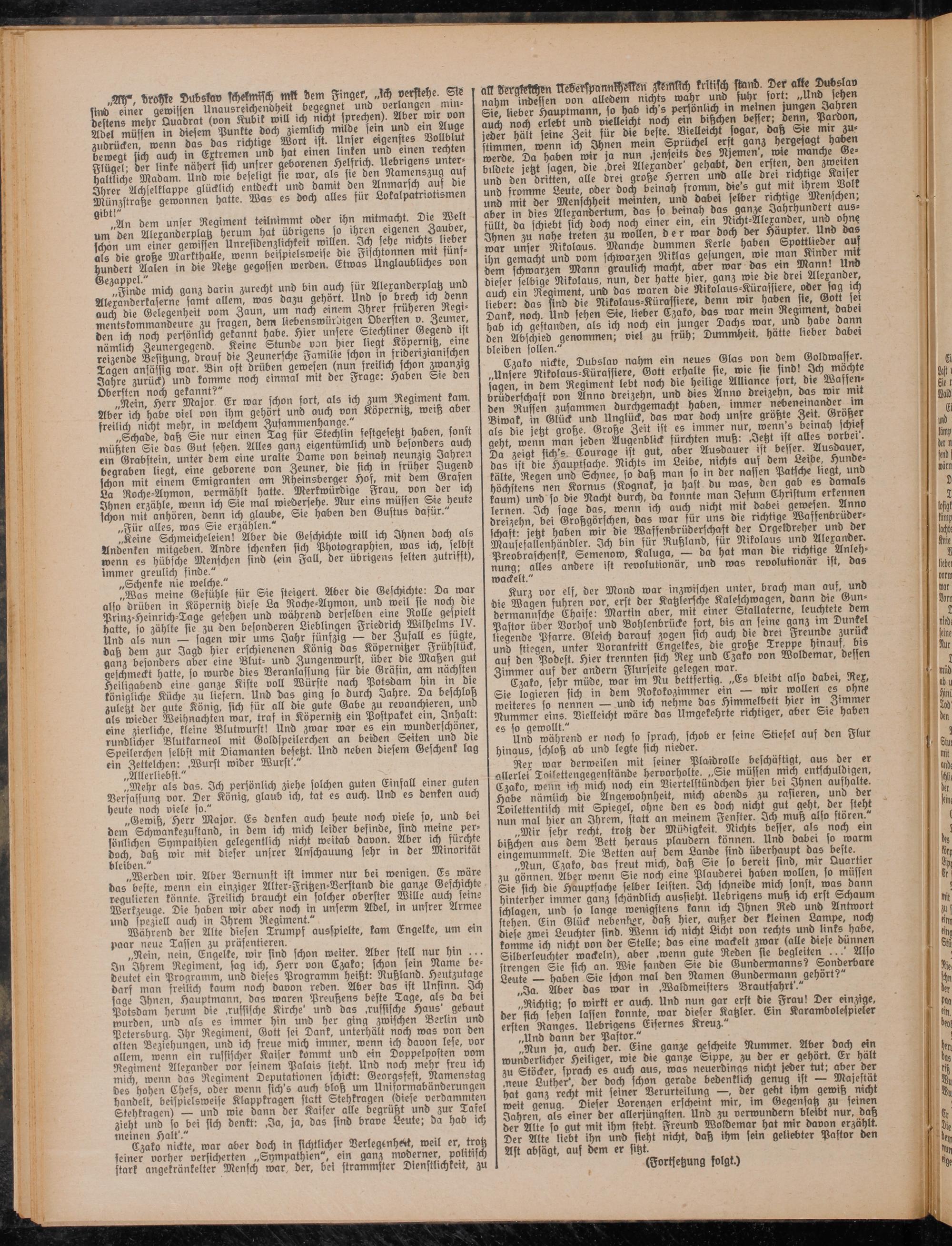 „Nein, nein, Engelke, wir sind schon weiter. Aber stell nur hin ... In Ihrem Regiment, sag ich, Herr von Czako; schon sein Name bedeutet ein Programm, und dieses Programm heißt: Rußland. Heutzutage darf man freilich kaum noch davon reden. Aber das ist Unsinn. Ich sage Ihnen, Hauptmann, das waren Preußens beste Tage, als da bei Potsdam herum die .russische Kirche' und das .russische Haus' gebaut wurden, und als es immer hin und her ging zwischen Berlin und Petersburg. Ihr Regiment, Gott sei Dank, unterhält noch was von den alten Beziehungen, und ich freue mich immer, wenn ich davon lese, vor allem wenn ein russischer Kaiser kommt und ein Doppelposten vom Regiment Alexander vor seinem Palais steht. Und noch mehr freu ich mich wenn das Regiment Deputationen schickt: Georgsfest, Namenstag des hohen Chefs, oder wenn sich'- auch bloß um Uniformabänberungen handelt, beispielsweise Klappkragen statt Stehkragen (diese verdammten Stehkragen) — und wie dann der Kaiser alle begrüßt und zur Datei zieht und so bei sich denkt: .Ja, ja, das sind brave Leute; da hab ich "" Czakochttckte, war aber doch in sichtlicher Verlegenheit, weil er, trotz seiner vorher versicherten „Sympathien", ein ganz mod e r ner, p o l i ti s ch stark angekränkelter Mensch war, der, bei strammster Dienststchkeit, zu