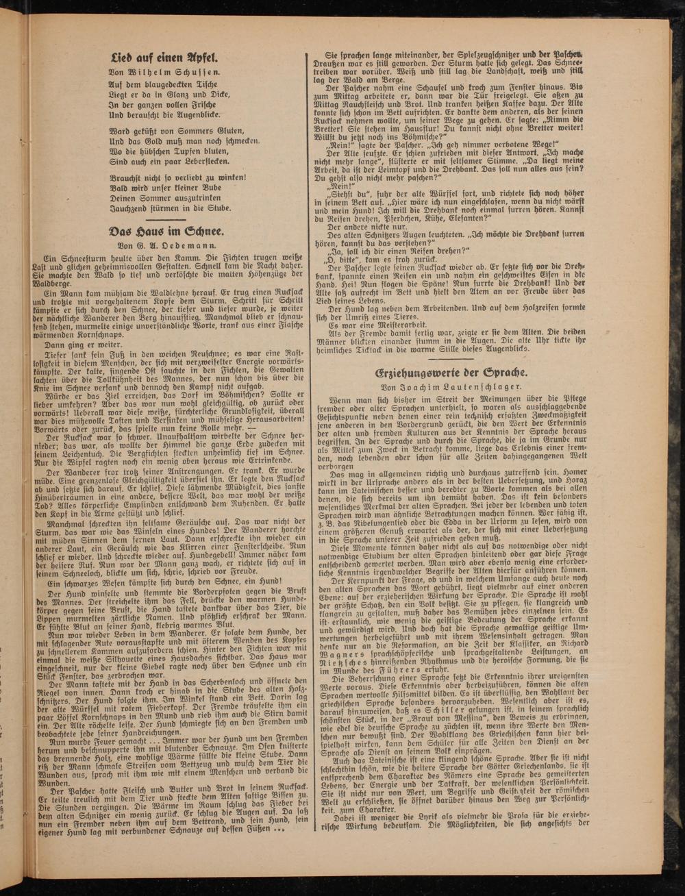 Der Kernpunkt der Frage, ob und in welchem Umfange auch heute noch den alten Sprachen das Wort gebührt, liegt vielmehr auf einer anderen Ebene- auf der erzieherischen Wirkung der Sprache. Die Sprache ist wohl der größte Schatz, den ein Volk besitzt. Sie zu pflegen, sie klangreich und klangrein zu gestalten, muh daher das Bemühen jedes einzelnen fein. Es ist erstaunlich, wie wenig die geistige Bedeutung der Sprache erkannt und gewürdigt wird. Und doch hat die Sprache gewaltige geistige Umwertungen herbeigeführt und mit ihrem Wesensinhalt getragen. Man denke nur an die Reformation, an die Zeit der Klassiker, an Richard Wagners sprachschöpferische und sprachgestaltende Leistungen, an Nietzsches hinreißenden Rhythmus und die heroische Formung, die sie im Munde des Führers erfuhr. .