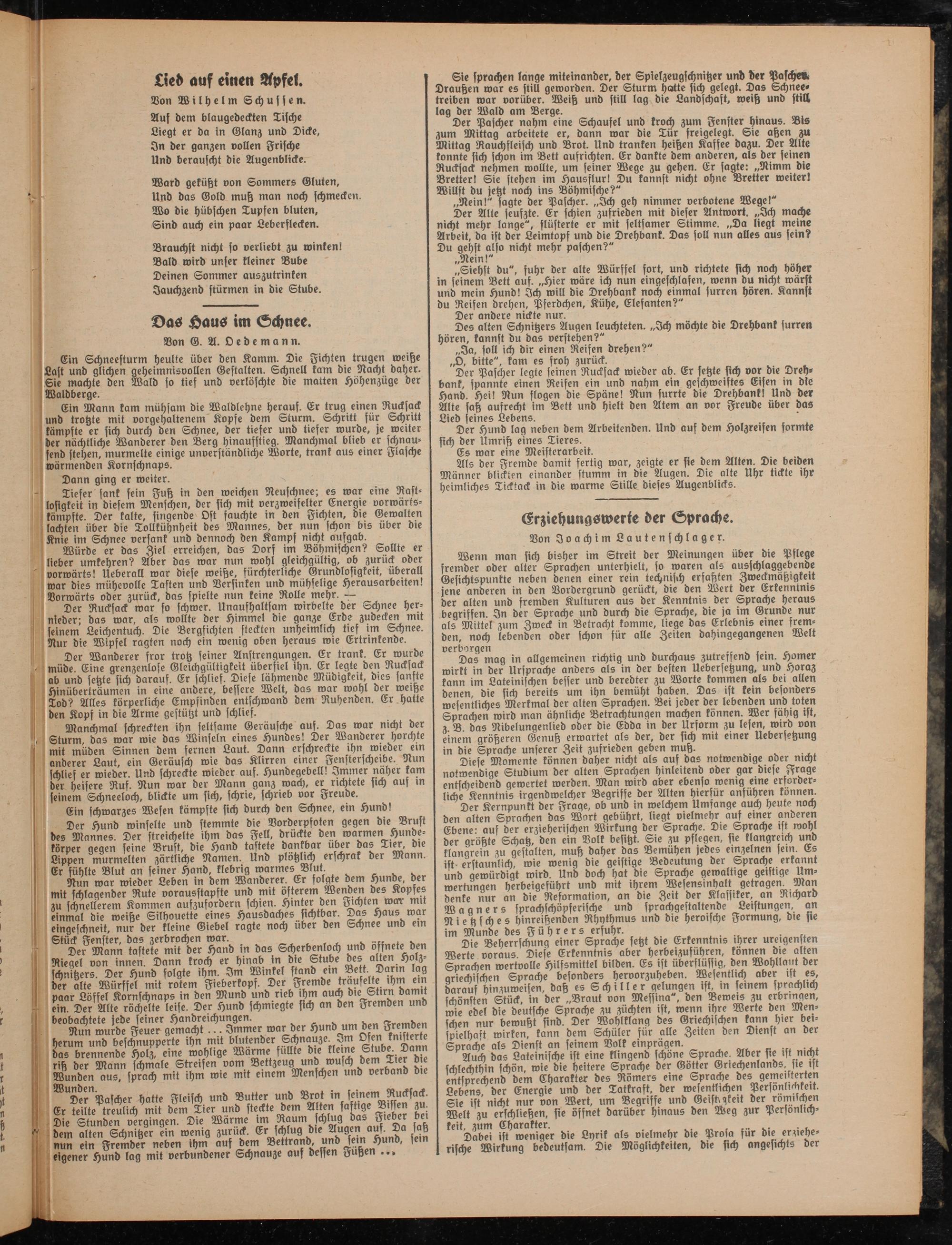 Der Pascher nahm eine Schaufel und kroch zum Fenster hinaus. Bis zum Mittag arbeitete er, bann war die Tür freigelegt. Sie atzen zu Mittag Rauchfleisch und Brot. Und tranken heitzen Kassee dazu. Der Alte konnte sich schon im Bett aufrichten. Er dankte dem anderen, als der feinen Rucksack nehmen wollte, um seiner Wege zu gehen. Er sagte: „Nimm die Bretter! Sie stehen im Hausflur! Du kannst nicht ohne Bretter weitert Willst du jetzt noch ins Böhmifche?"
