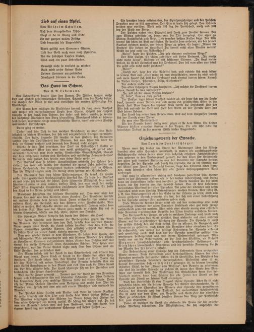 Nun war wieder Leben in dem Wanderer. Er folgte dem Hunde, der mit schlagender Rute vorausstapfte und mit öfterem Wenden des Kopfes zu schnellerem Kommen aufzufordern schien. Hinter den Fichten war nut einmal die weiße Silhouette eines Hausdaches sichtbar. Das Haus war eingeschneit, nur der kleine Giebel ragte noch über den Schnee und em Stück Fenster, bas zerbrochen war.